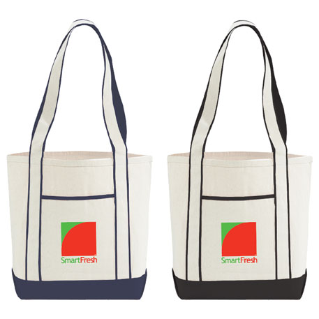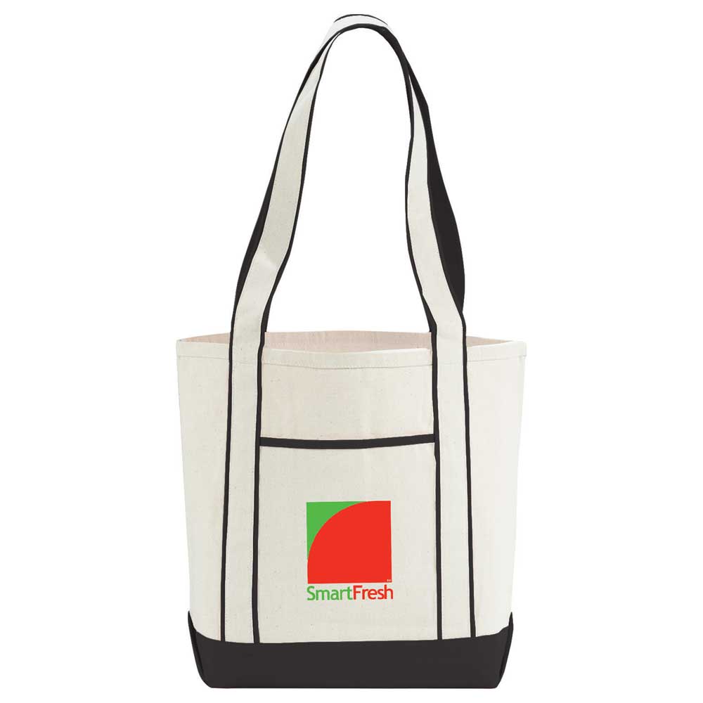 Classic boat tote shape great for outdoor events. Open main compartment. Front pocket. Unique contrast handle treatment. 13″ handle drop height.