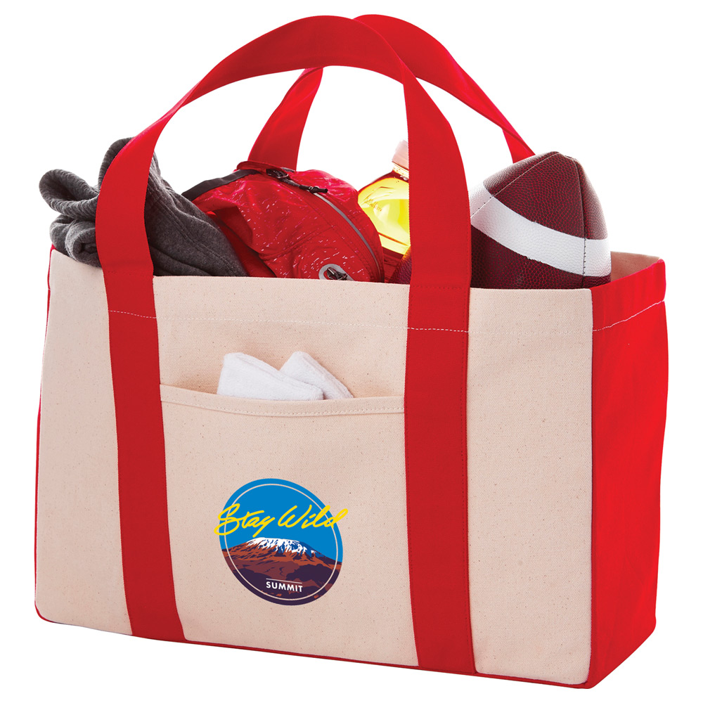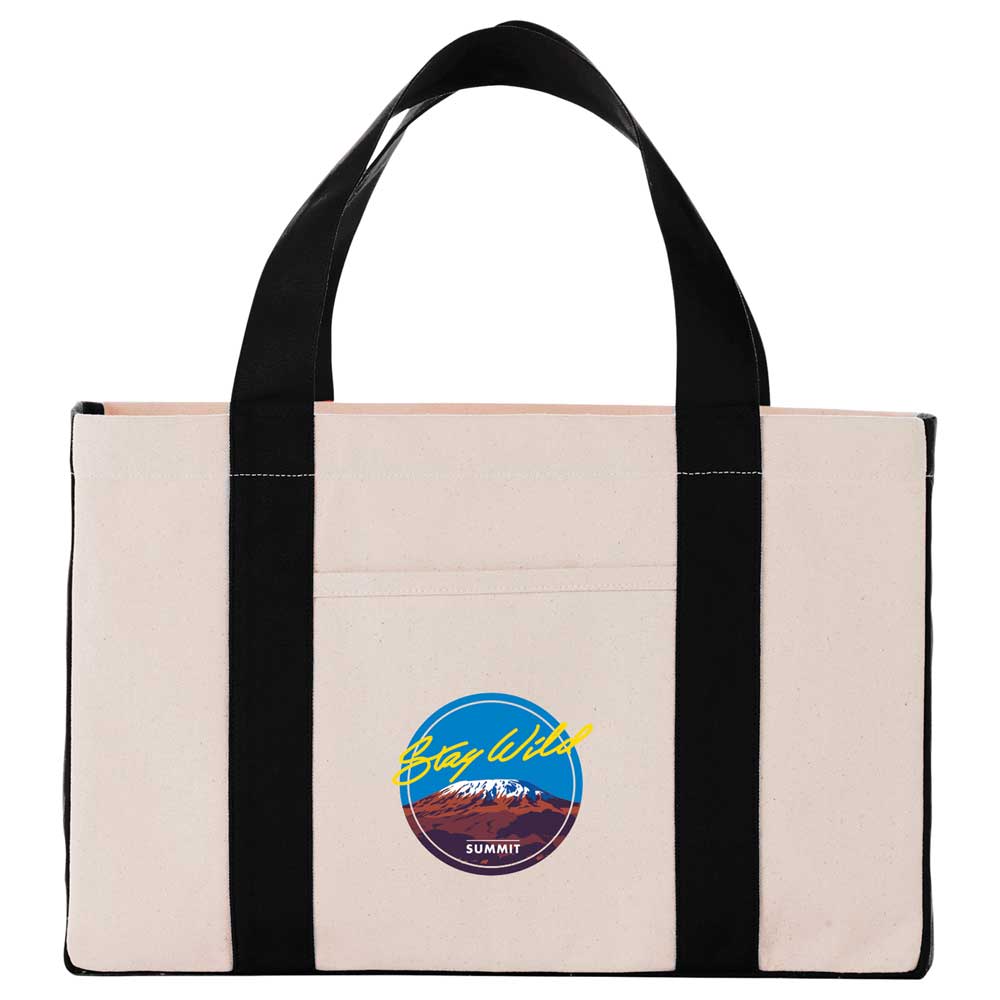 Durable 18 oz. cotton canvas material is perfect for various uses such as groceries, sports equipment, beach gear, or everyday carry. Open main compartment and front slash pocket. 9″ drop handles.