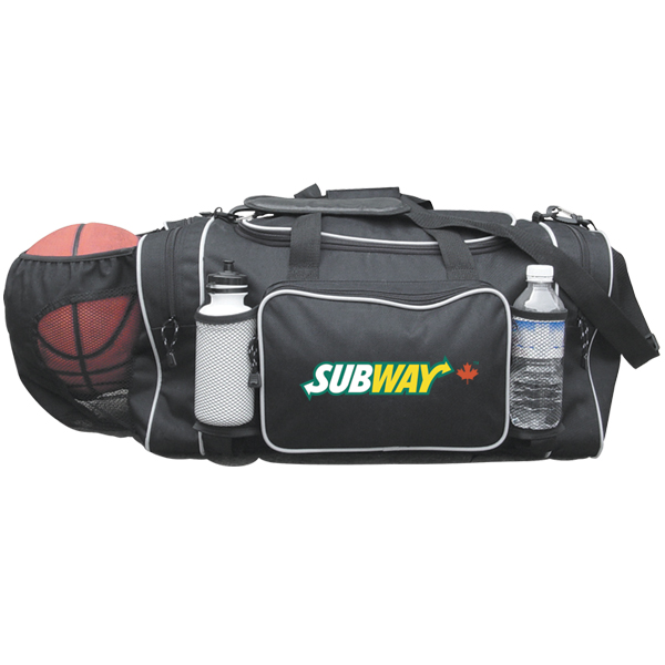 23.5″ W x 13″ H x 11.5″ D • 600D Polyester • Dual side mesh water bottle pockets • End elasticized mesh pocket holds basketball/soccer ball • Card holder on side perfect for team numbering • ‘U’ shaped top zipper opening WATER BOTTLES NOT INCLUDED SP PP PS EMB – 8″ W x 5″ H (front pocket) SP PP PS EMB – 7″ W x 7″ H (End pocket) SP PP PS EMB – 8″ W x 5″ H (Top lid)