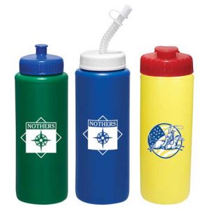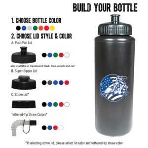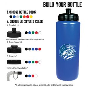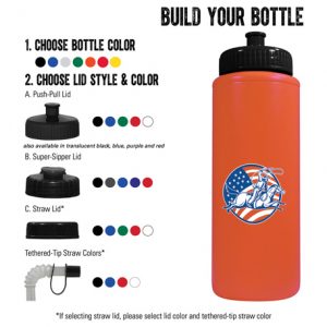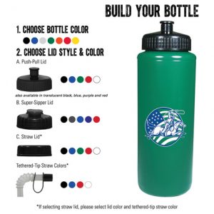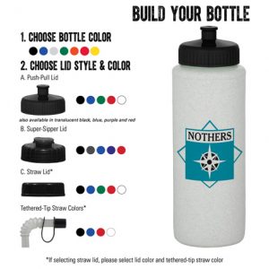 HumphreyLine 32-ounce sports bottle comes in an array of fun colors and your choice of lid: push-pull, super sipper or straw with tethered-tip. Must specify bottle color as well as lid type & color. Bottles ship assembled. Lid and bottle colors may vary/may not match. Contrasting colors recommended. Made in USA. Hand wash only. Follow any included care guidelines.