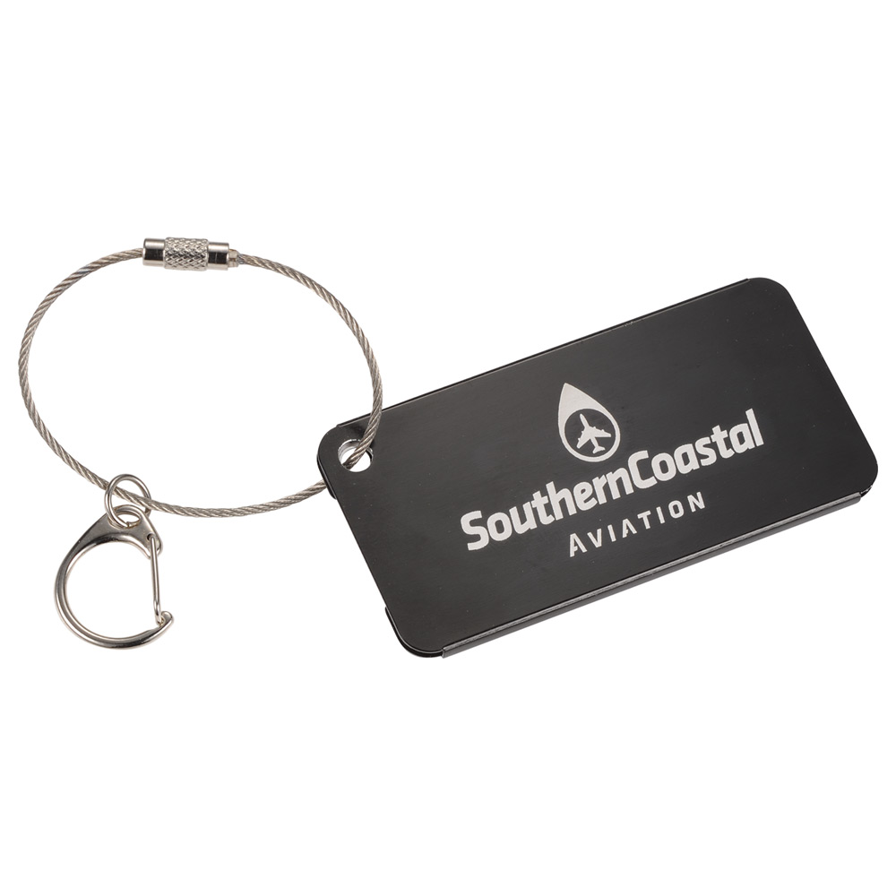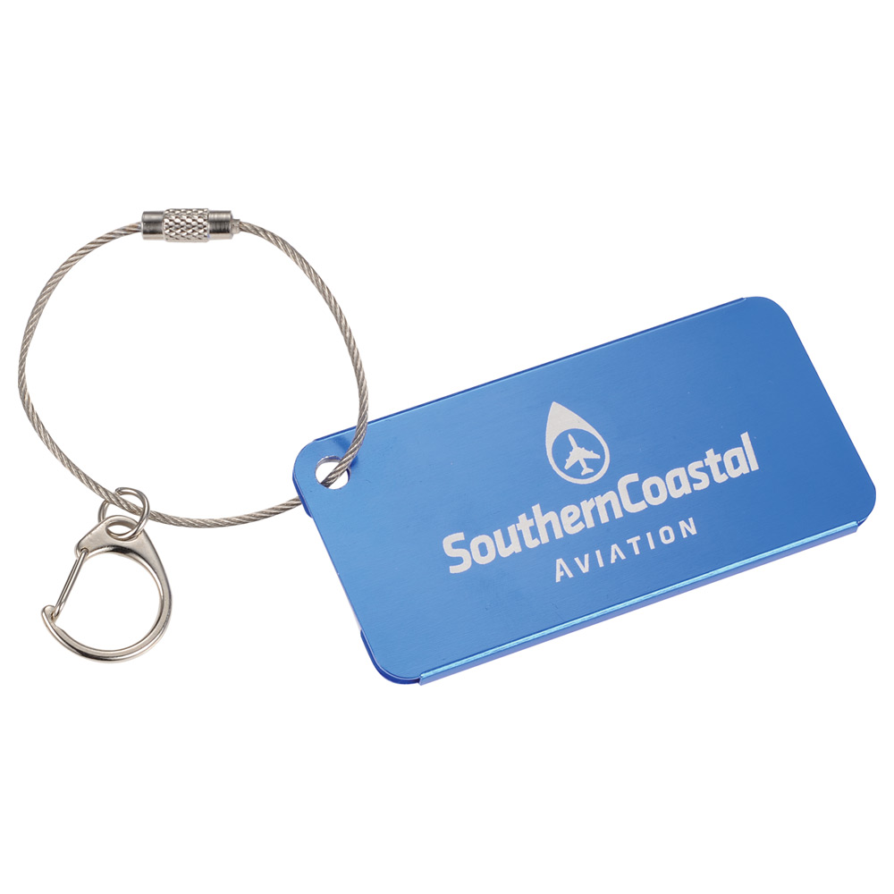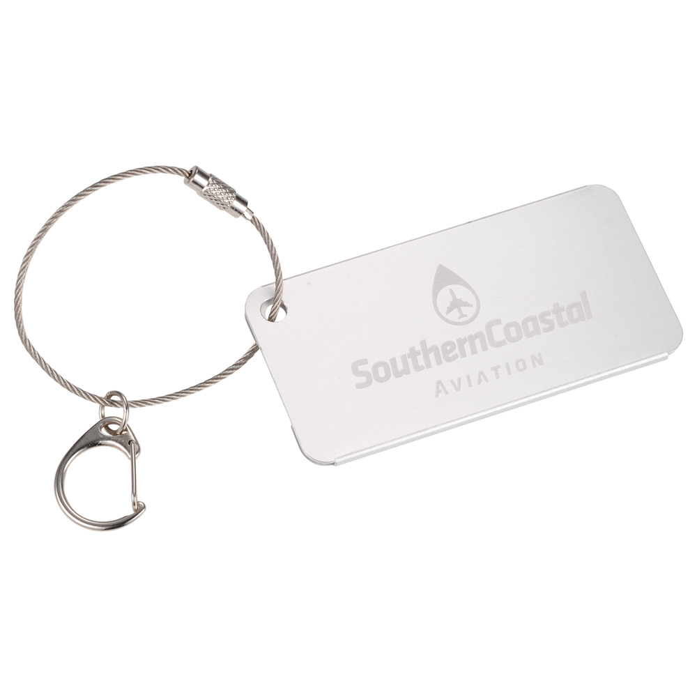 Aluminum tag with metal wire twist action closure and secondary clip attachment option. Size: 3” X 1.5”.