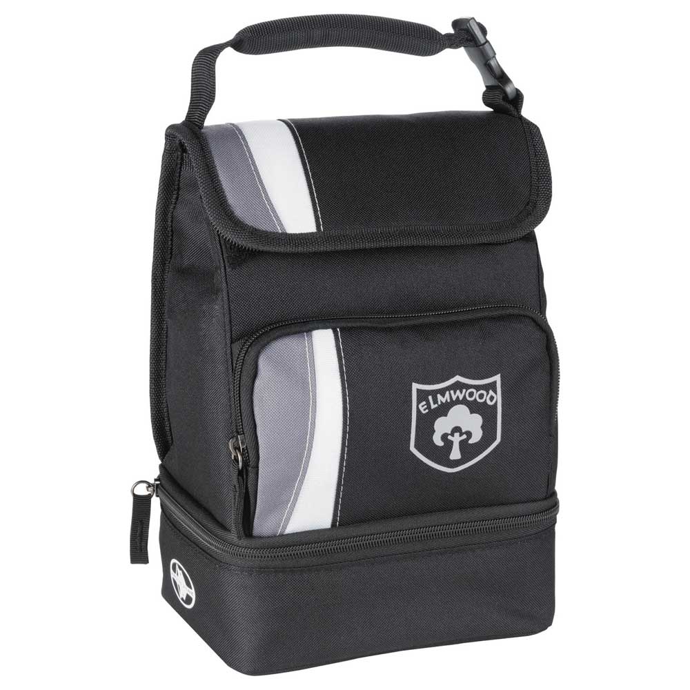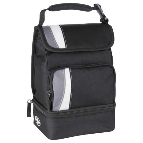 Two compartments using high density insulation; top compartment that can be folded over or with zipper for extra capacity and bottom zippered compartment includes food container. Rear ID window. Padded carry handle with Swing Clip™ allows attachment to backpacks or briefcases.Ultra Safe™ leak-proof, easy clean PEVA lining.
