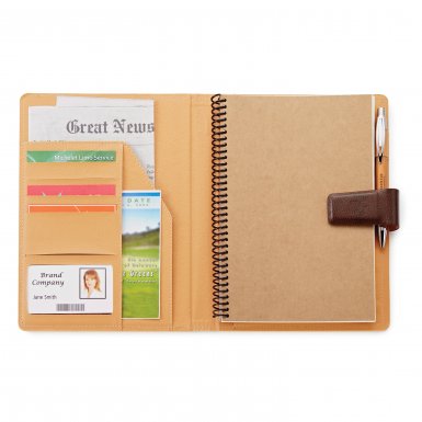 Bamboo and vinyl trim journal cover with vinyl lining, matching pen loop (pen not included) and a refillable spiral bound ECO journal containing 200 ivory lined pages