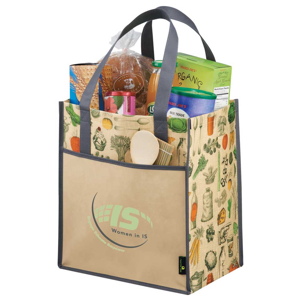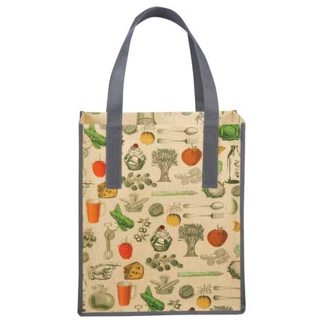 Organic veggies and antique kitchen utensils take center stage in this vintage print. Perfect alternative to plastic bags. Large open main compartment. Supportive bottom board. Contrasting regular polypropylene front open pocket. Matte finish. Laminated material is water-resistant and easily wipes clean. Reinforced handles and binding for added durability. 10″ handle drop height.