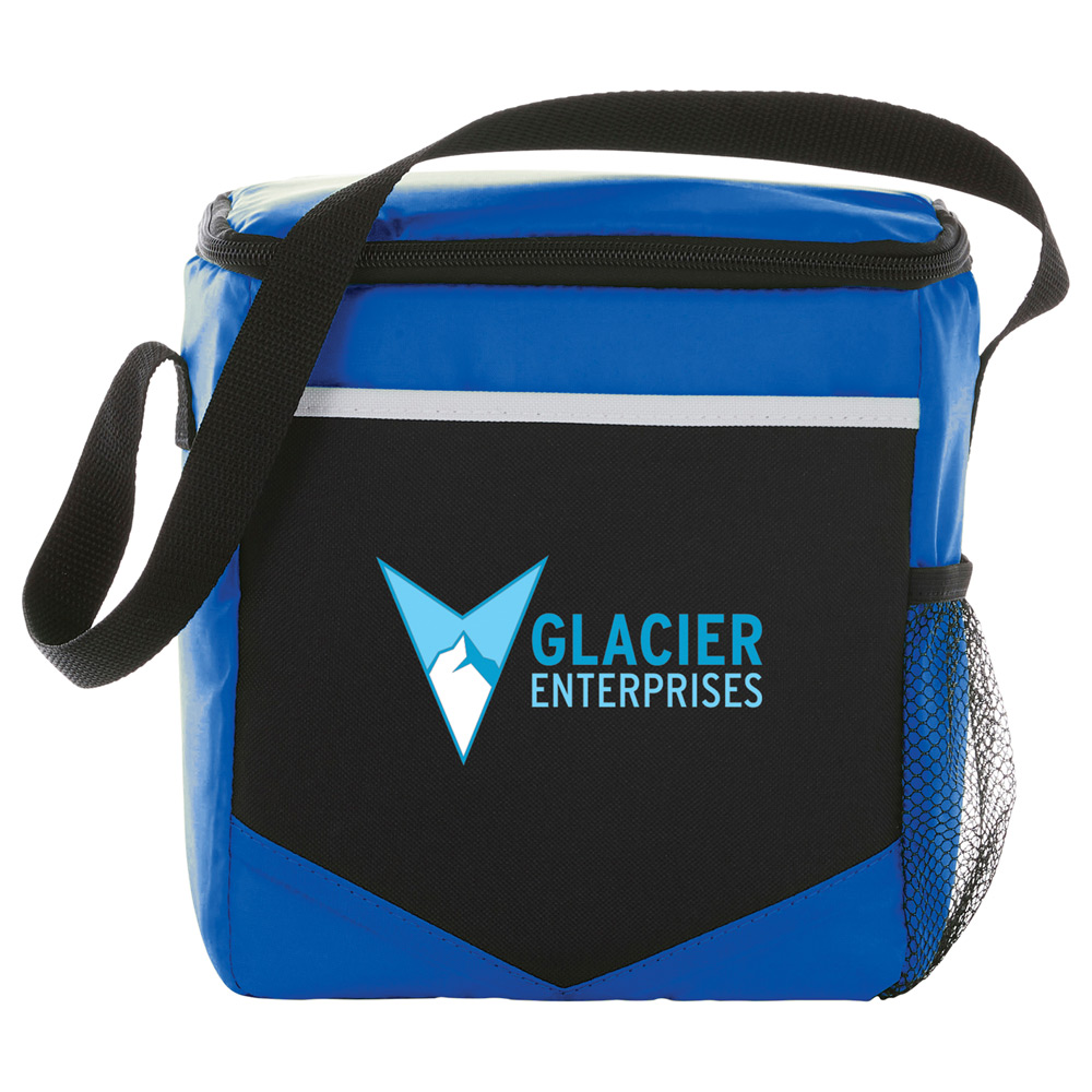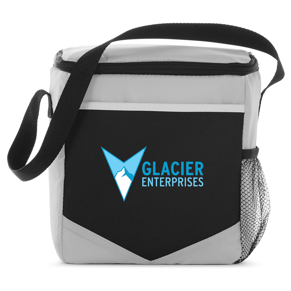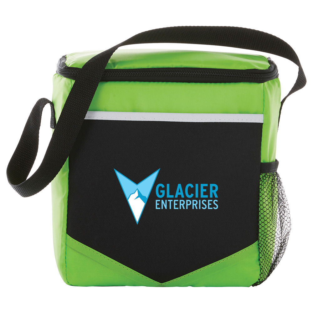 Insulated PEVA lining. Front pocket for decorating. Side mesh pocket. Holds approx. 9 cans.