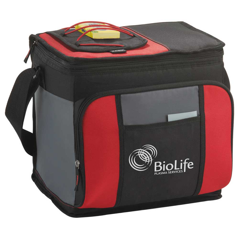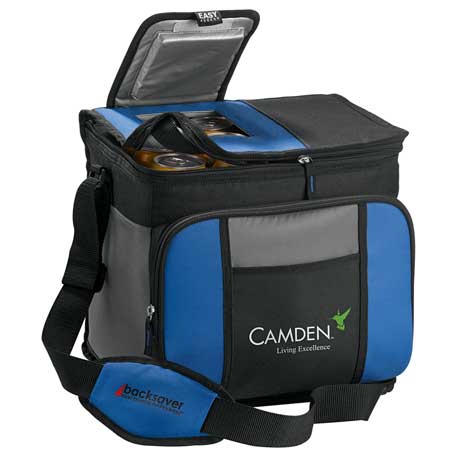 Zippered main compartment holds up to 24 cans. Zippered front compartment. Easy-access lid allow for quick retrieval of chilled items. High density thermal insulation. Backsaver™ technology combats the strain of carrying a loaded cooler. Ultra Safe™ leak-proof, easy clean PEVA lining. Collapses for easy storage.