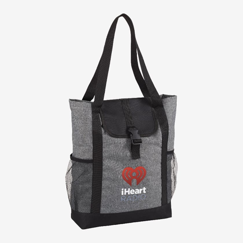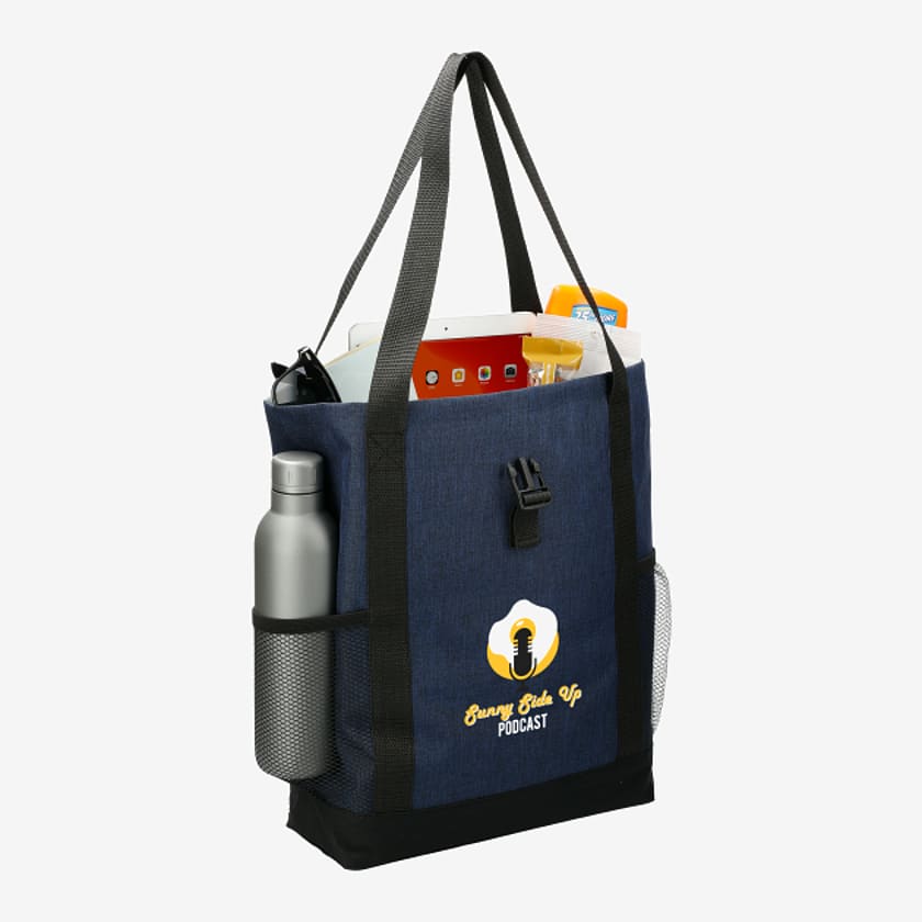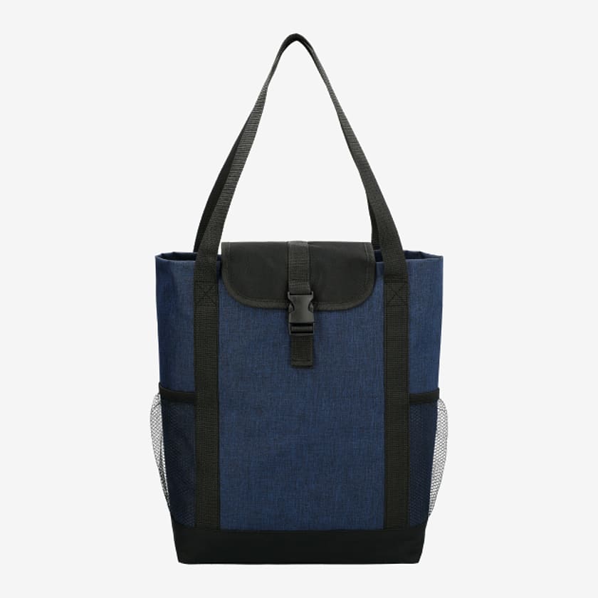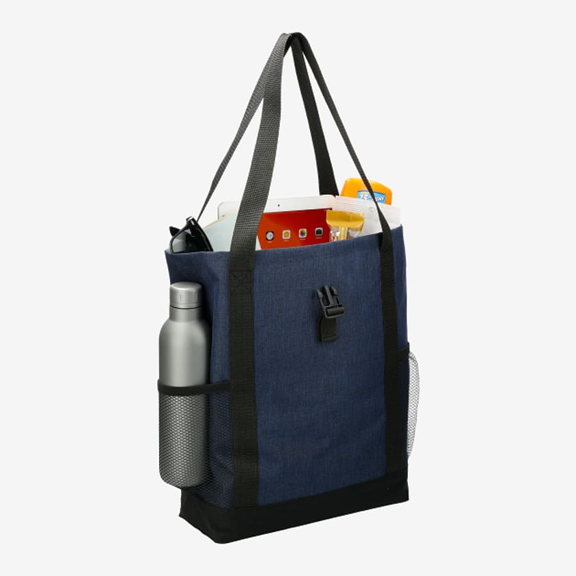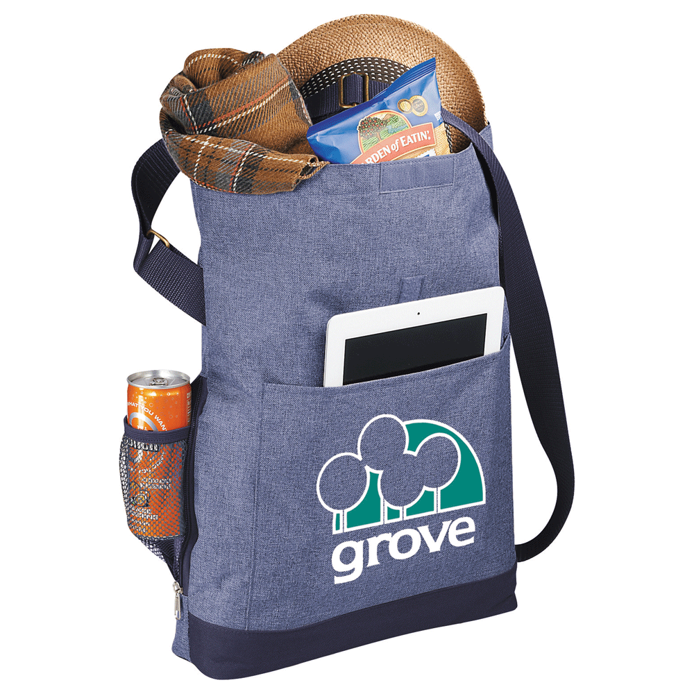 Part of the Fade Away Trend Collection, fashionable fold-over style with on-trend chambray print makes this tote the perfect choice for the stylish business man or woman. Open main compartment folds over with hook and loop flap closure. Open front pocket with hook and loop closure is the perfect size to hold most iPads, tablets and eReaders in their cases. Side features a hidden zippered bottle or valuables pocket. Adjustable shoulder strap for cross-body wear.