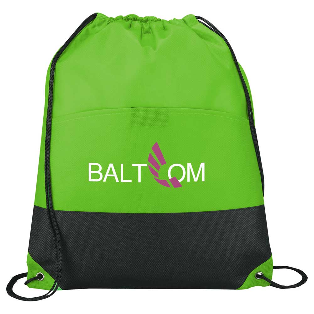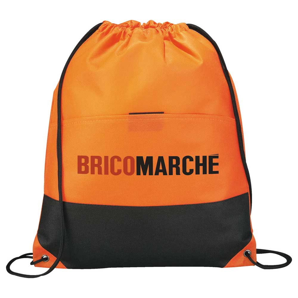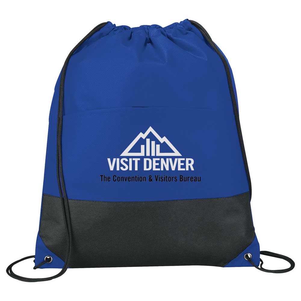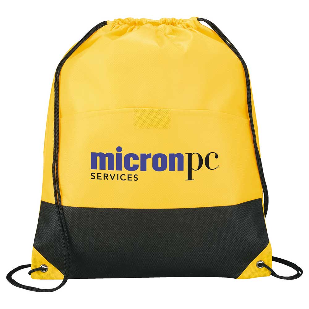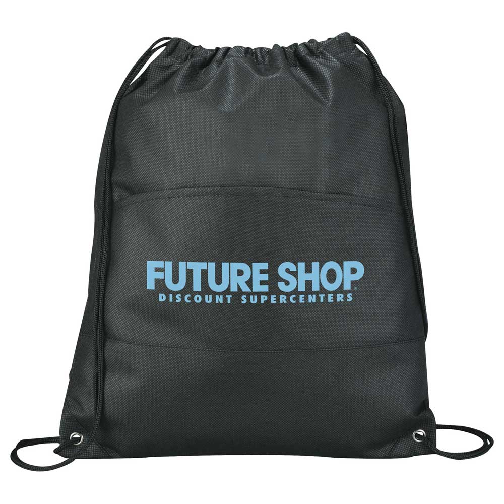 The Coast Non-Woven Drawstring Bag has an open main compartment with a cinching rope closure. It also features a front pocket with hook and loop closure.