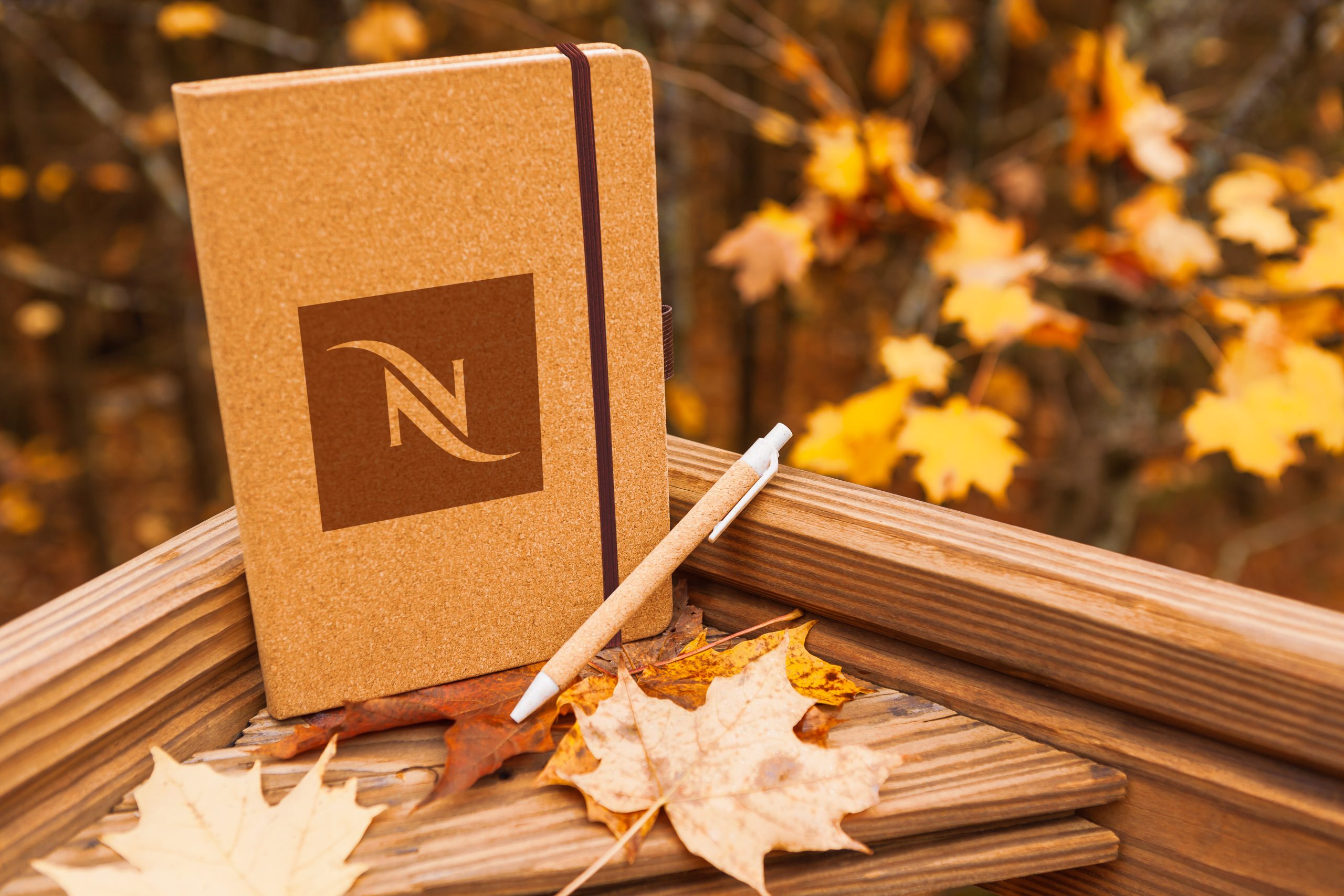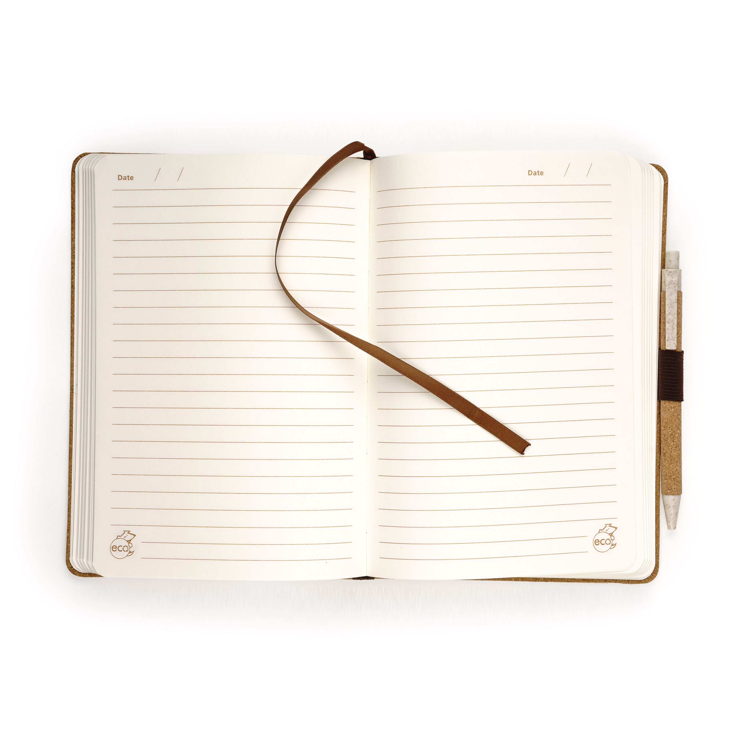 The Cork hard cover journal combo is an eco-friendly A5 size non-refillable perfect bound journal with an elastic closure, a satin ribbon bookmark and interior gusseted pocket. Jot your thoughts away inside this eco-friendly journal as it offers 192 ivory lined perforated pages with date feature, made with 100% recycled paper. Stash the included EC146 Cork ballpoint pen into the pen loop after journaling. This item is biodegradable – simply separate the elastic and ribbon trims to compost the cork cover and recycle the inner pages. (Journal inner page dimensions: 5 9/16” x 8 1/8”).