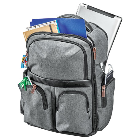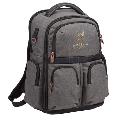 Just like the ever-changing weather in the Pacific Northwest, the Bainbridge collection is rich in contrasts. The Cutter & Buck Executive Backpack takes carrying your gear to the next level. This stylish bag features custom hardware and high quality material such as leather accents. Stay charged on the go with the USB port and cable that feeds into the large zippered main compartment. This bag offers tons of zippered pockets and organization, as well as a dedicated 15” computer sleeve. Keep your belonging safe and secure with the back zippered RFID pocket. Use the mesh, padded trolley sleeve to take this bag on the go with ease.