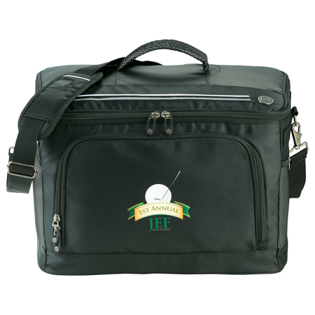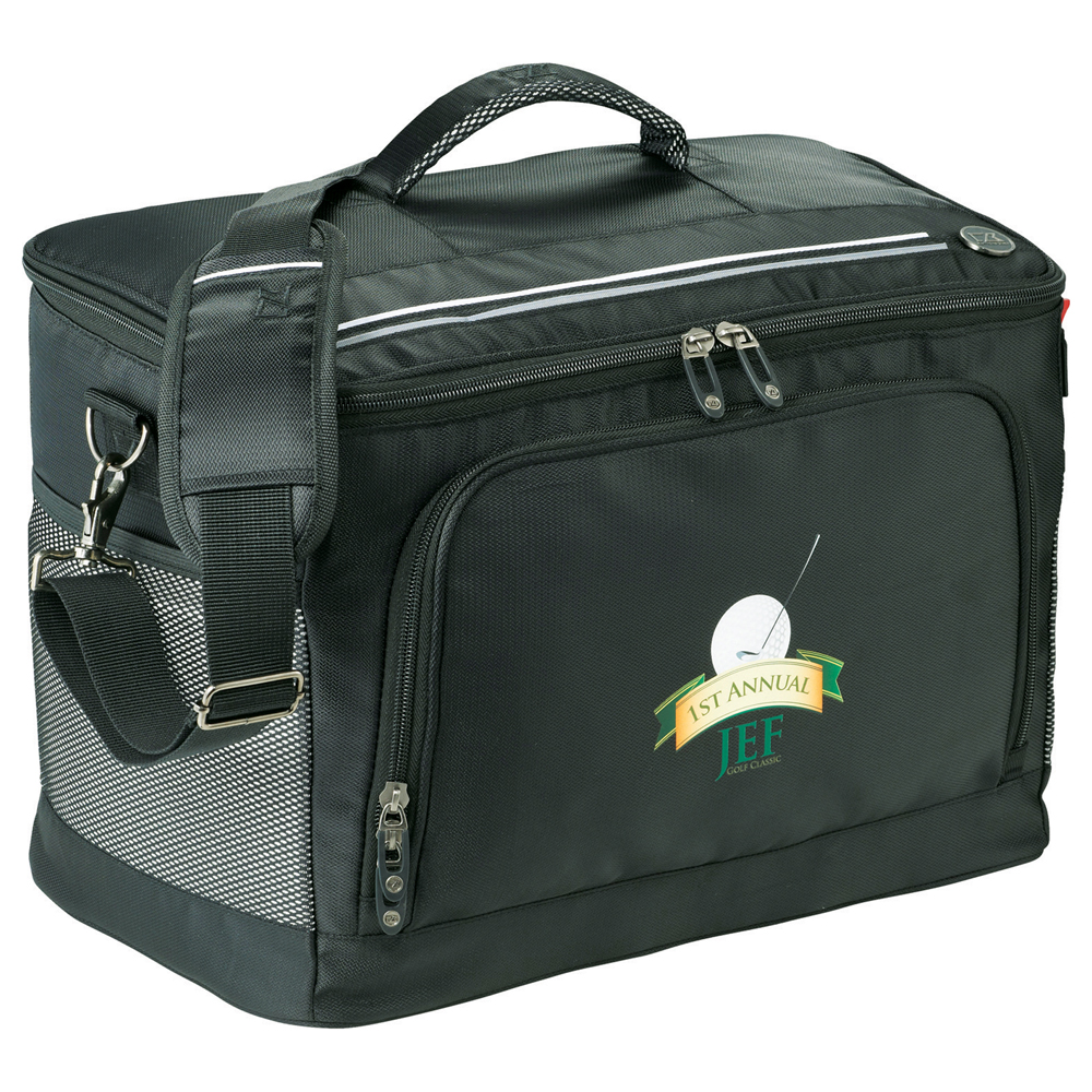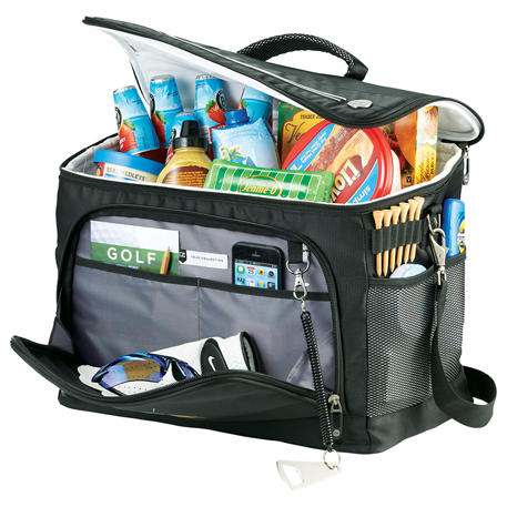 Part of the sporty Cutter & Buck® Tour Collection. Great for cooling beverages on or off the golf course. Zippered main compartment holds up to 36 cans. Zippered front pocket with additional organization for golf or sport accessories. Two side mesh pockets. Padded carry handle. Removable, adjustable padded shoulder strap for easy carrying. Insulated PEVA lining. Cutter & Buck hardware and branding details.