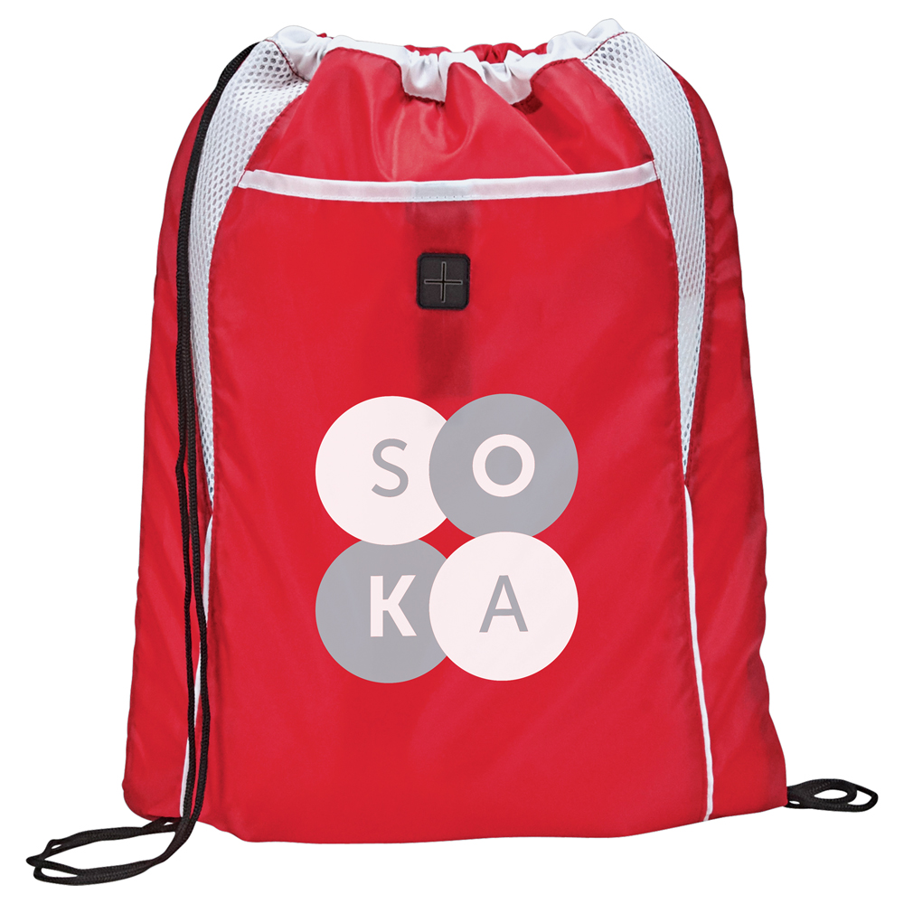 The Dart Drawstring Bag is kid-friendly and has a large open main compartment with a cinch closure. This bag has added features like a front pocket with hook and loop closure, an ear bud port for easy access and mesh detailing.