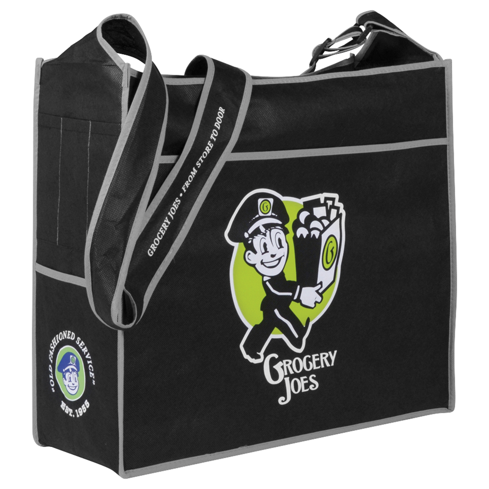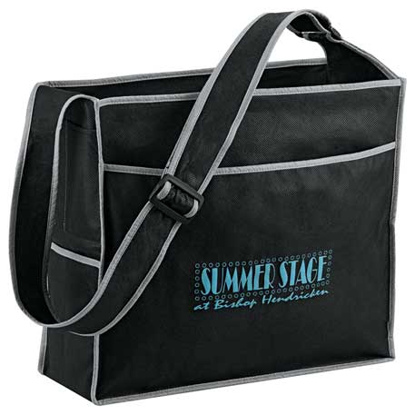 Great for tradeshows, conventions and business meetings. Open main compartment. Supportive bottom board. Open front pocket. Side organization includes pockets, plastic ID window, pen sleeves and business card holder. Reinforced adjustable shoulder strap; adjusts up to 21″. Gusset & Handle Decorating is Transfer/PhotoGrafixx Only and does not qualify for SureShip.