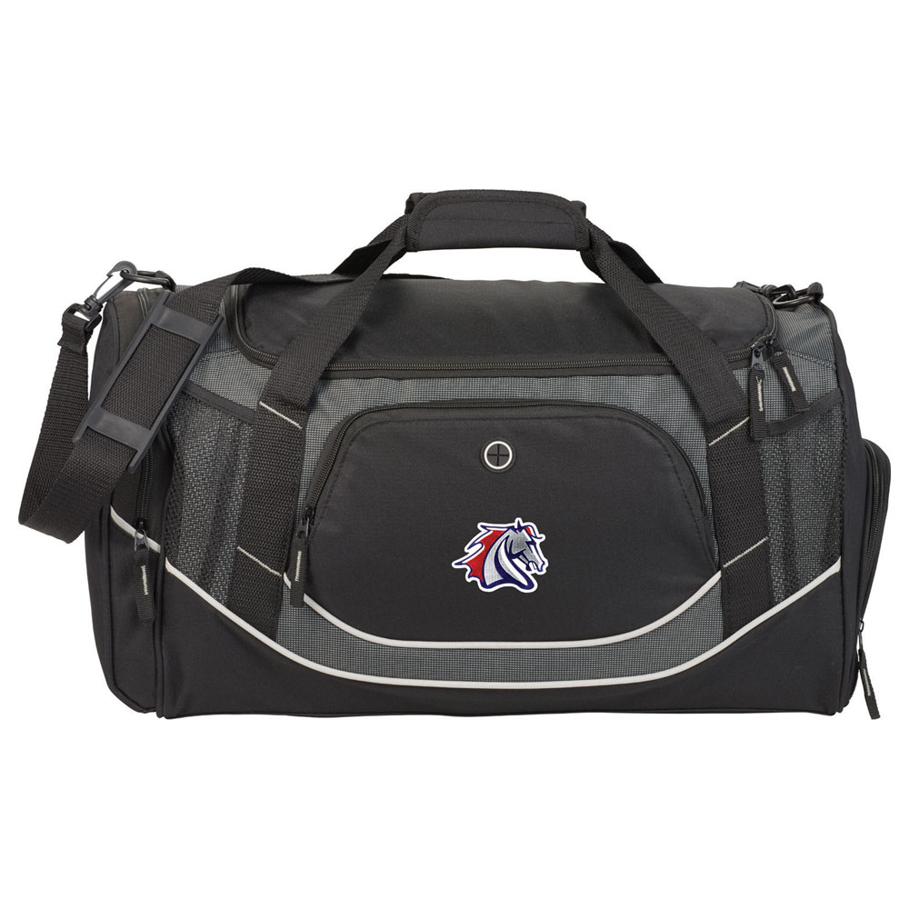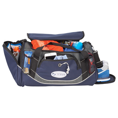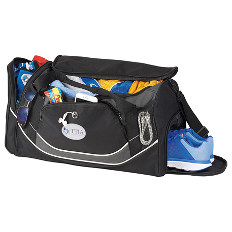 Zippered U-shaped main compartment. Two zippered side pockets (one with shoe pouch). Front zippered pocket with mesh accessory pockets inside and an earbud port. Two front mesh pockets for accessories. Haul handle with comfort wrap. Detachable, adjustable shoulder strap.