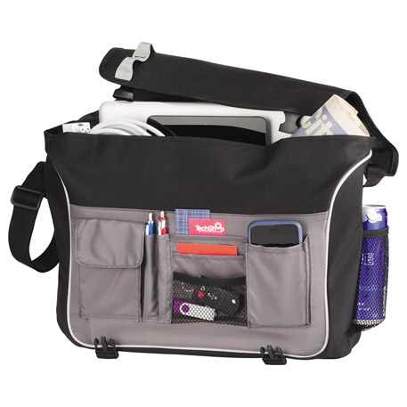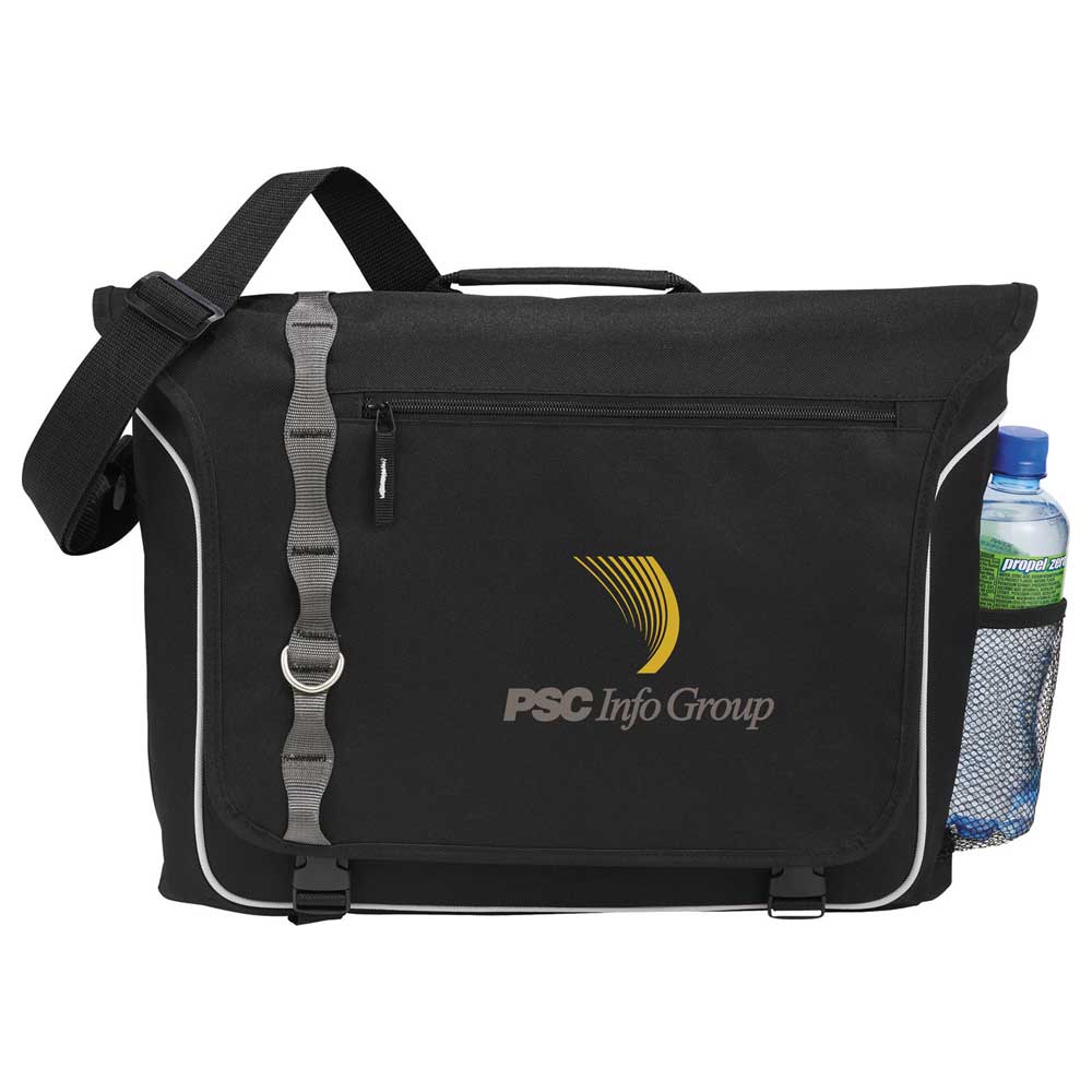 Horizontal messenger holds up to 17″ laptops and your iPad or tablet device. Organization under flap for your phone, business cards, pens, and other accessories. Large main compartment to hold everything else you need. Front features daisy chain to allow you to clip anything else you would like to the exterior. Mesh side pocket and trolley pass-through.