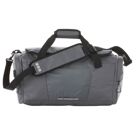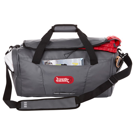 Protects your gear from the elements with water-resistant tarpaulin fabric. Adjustable removable padded shoulder strap, button closure carry handles, and side- grab handle make this bag extremely versatile to carry. Zippered side pocket. Open front pocket with reflective latchpoint accents. Zippered side shoe pocket. Trolley strap for easy pairing with wheeled luggage.