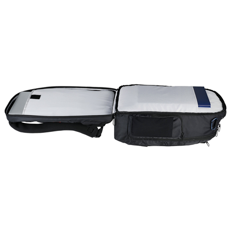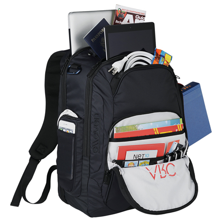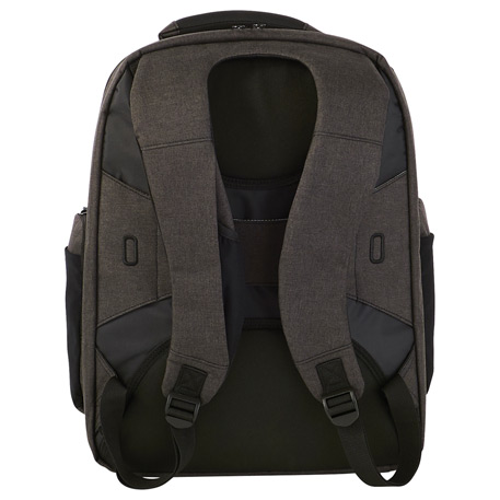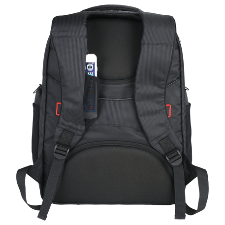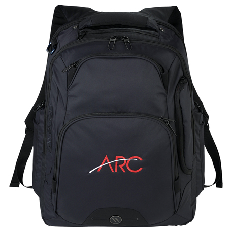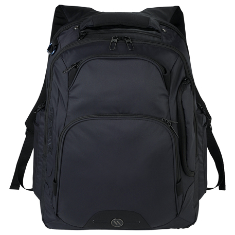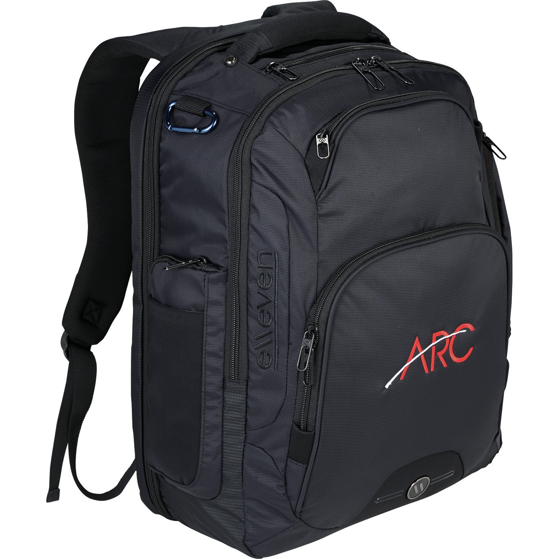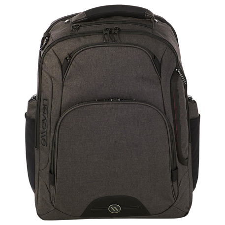 The elleven™ Rutter TSA 17 inch Computer Backpack incorporates executive looks with modern technological and travel needs. Fits most 1 inch laptops in a padded rear computer compartment while the main compartment includes a file divider and dedicated iPad®/tablet pocket. Zippered top nylex-lined pocket fits your iPhone® or other smartphone. Special RFID pocket on the front helps prevent identity theft by shielding your credit card and passport. Additional front pocket includes deluxe organization while the zippered side pockets are perfect for your cables or portable power and the dual mesh side pockets for your water bottle. There is even a hidden mesh pocket on the backpack strap for your phone or ID. Includes a padded neoprene handle, back and adjustable shoulder straps. A trolley handle attachment is integrated into the back panel. Free run charges for embroidery up to 7500 stitches. Disclaimer: There may be minor variations in color of the actual product.