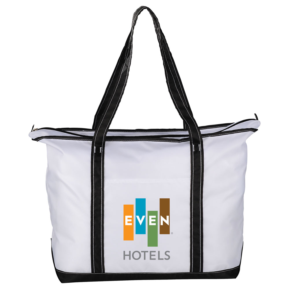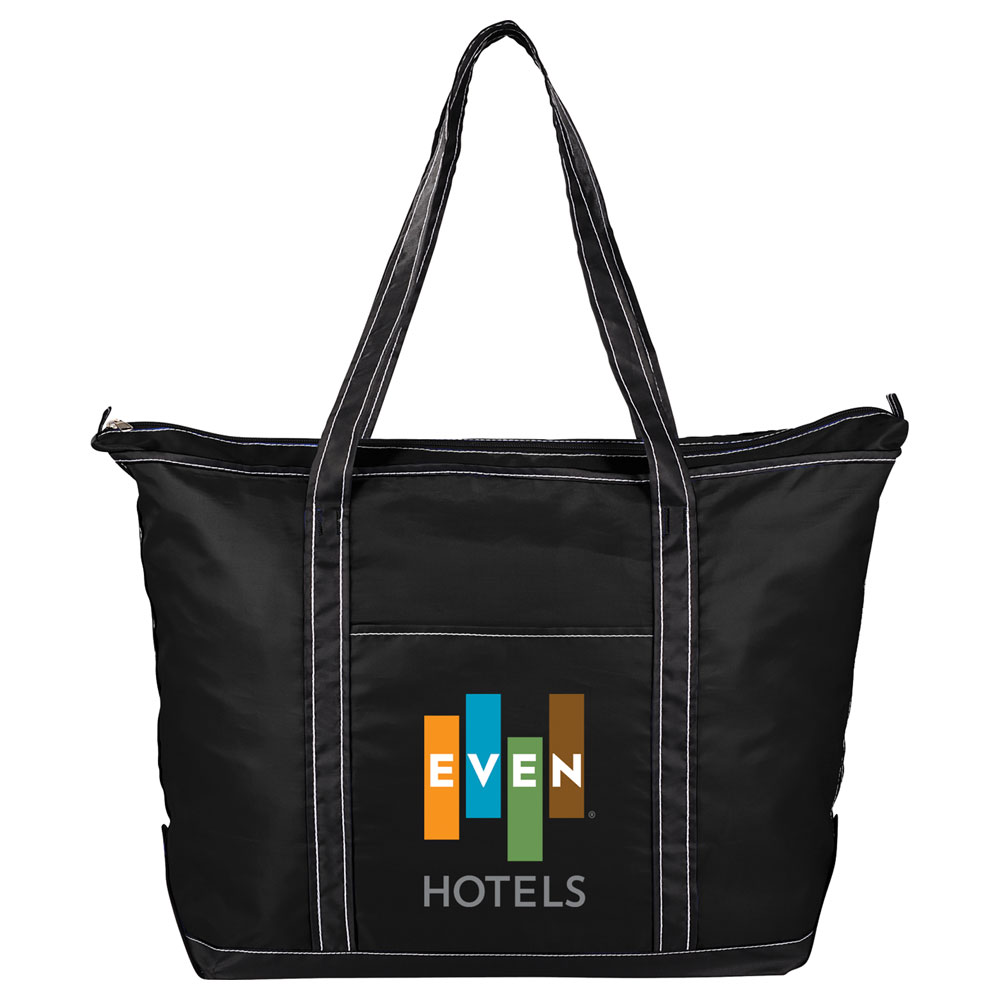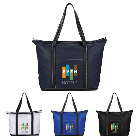 Large zippered main compartment. Perfect bag or everyday essentials, beach bag or travel bag. Large front slash pocket. Color pops and accent stitching.