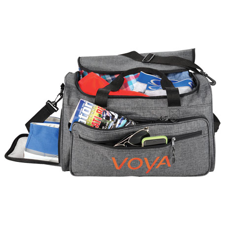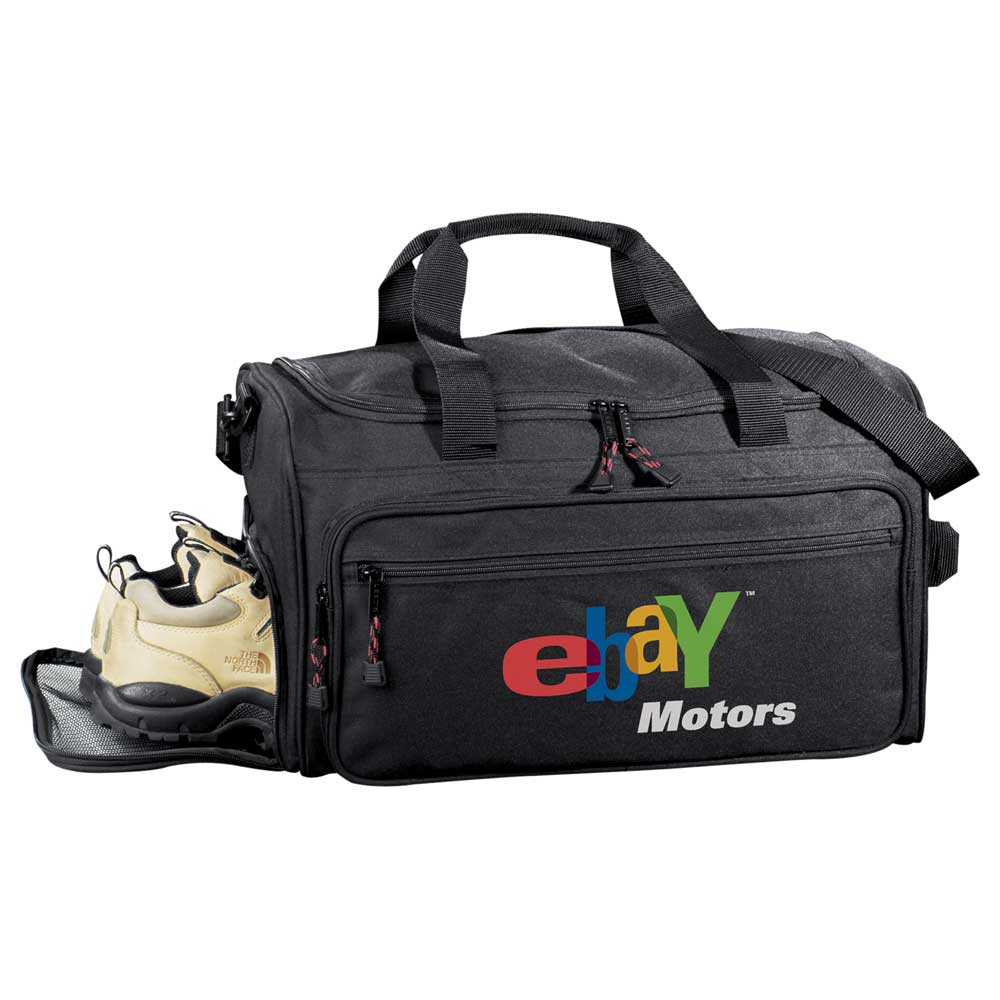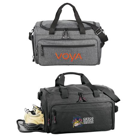 Zippered main compartment with bottom board. Zippered end pocket for shoes. Gusseted front pocket. Detachable, adjustable shoulder strap.