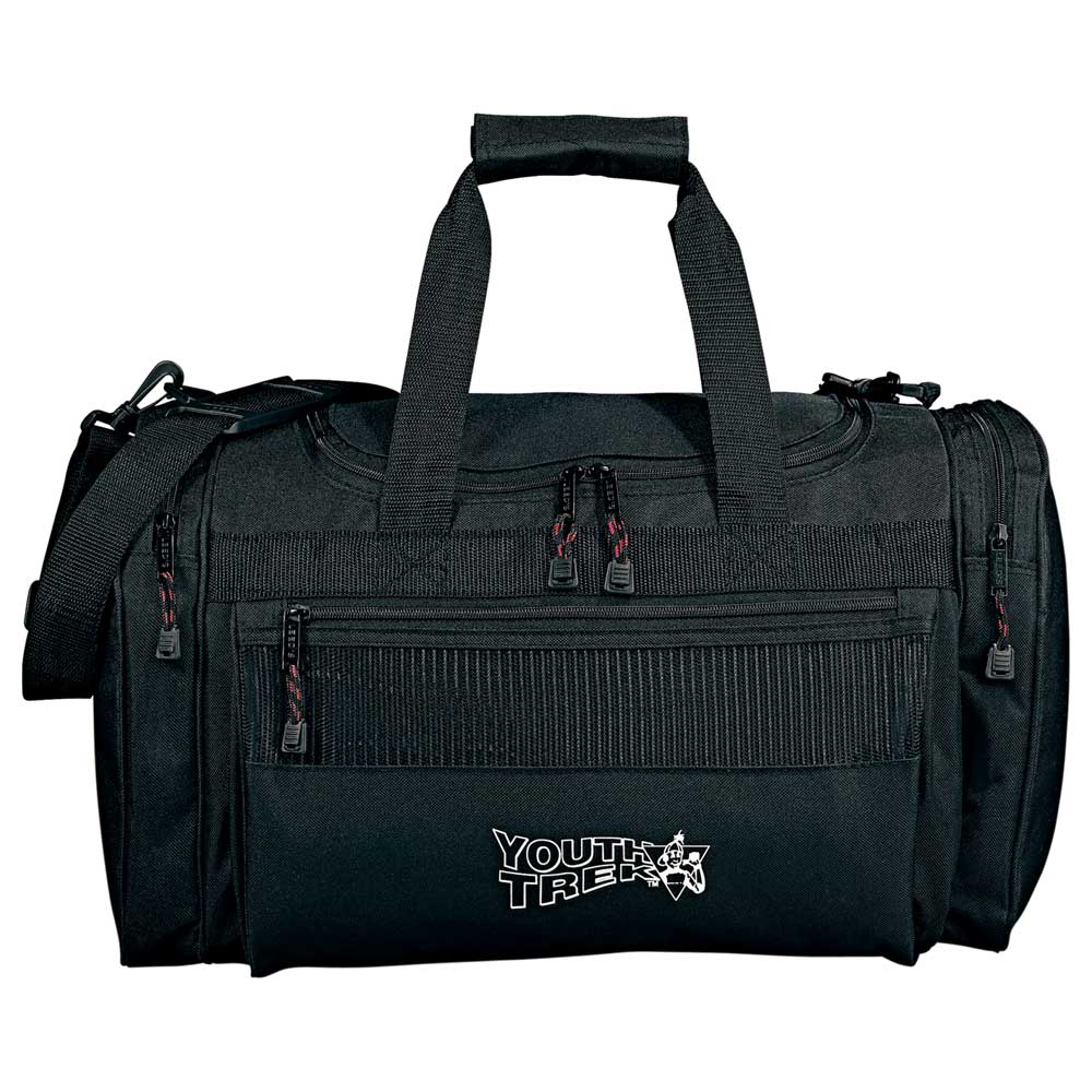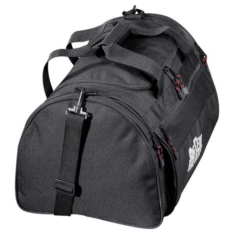 Zippered main compartment. Zippered front and end pockets. Detachable, adjustable shoulder strap.