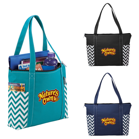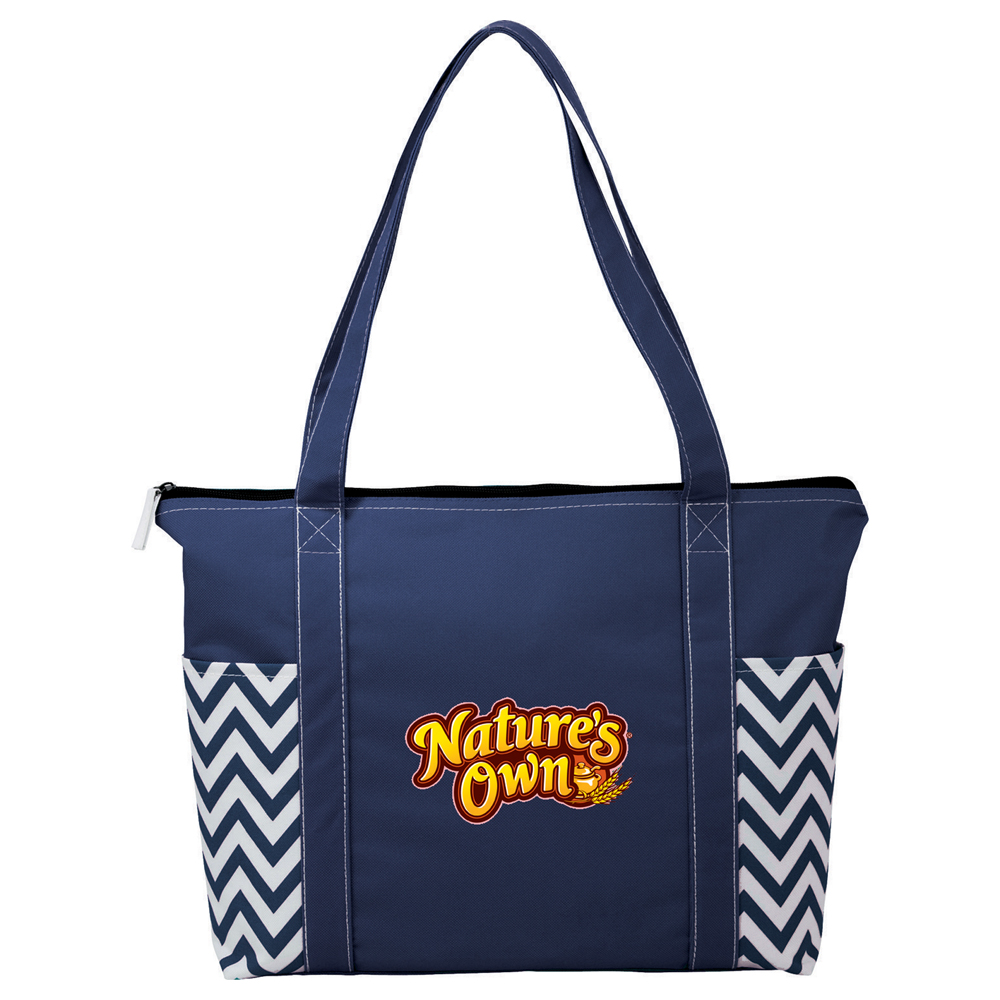 Part of our Bold Geometry trend collection, this business tote features a graphic chevron design. Zippered main compartment. Two side pockets. Reinforced handles. 11″ handle drop height.