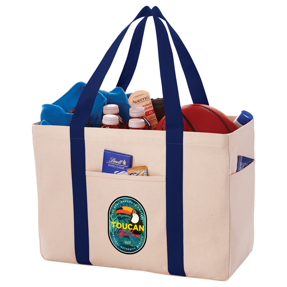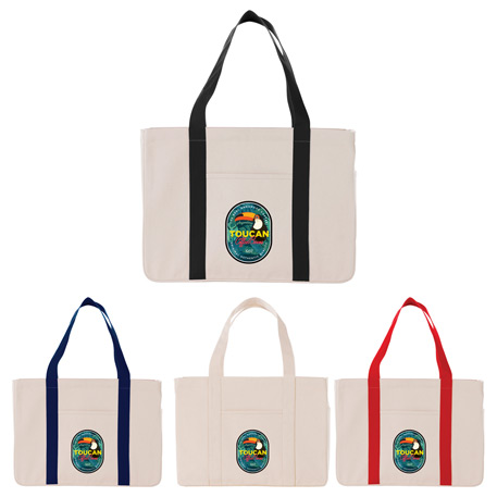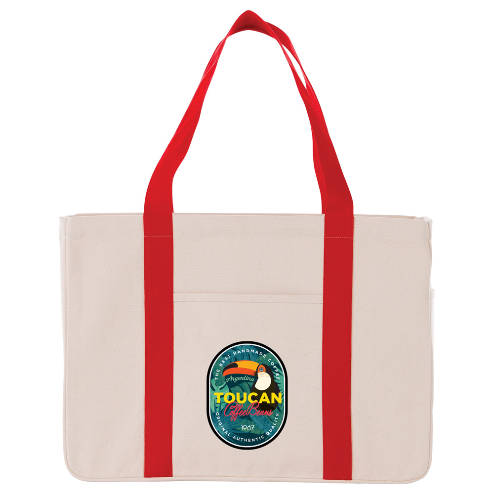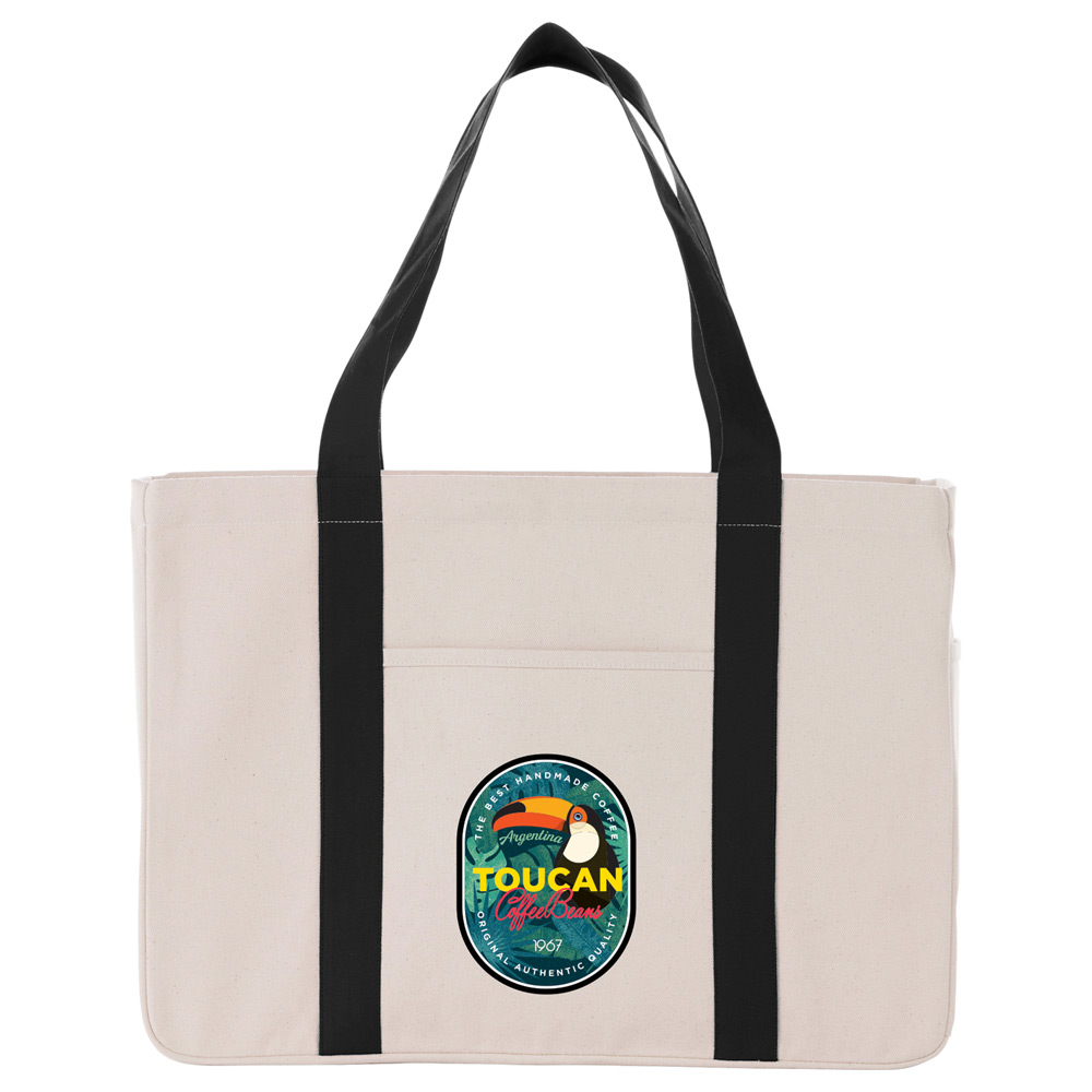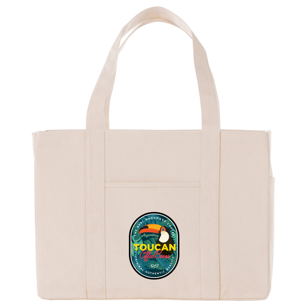 Durable 20 oz. cotton canvas material. With its super capacity open main compartment this tote can haul the heaviest loads. The convenient front slash pocket is great for quick access and a side water bottle/phone pocket completes the look. 12″ drop handles.