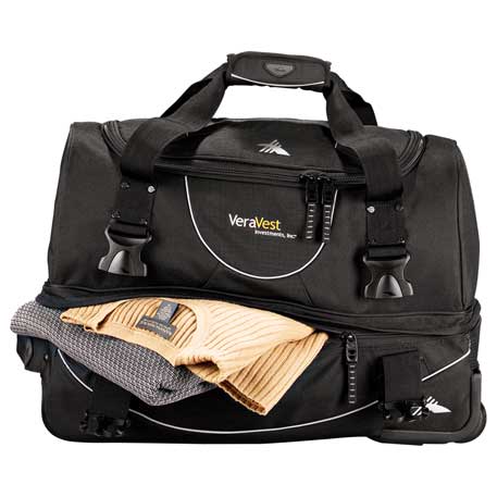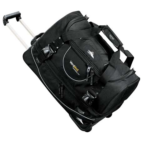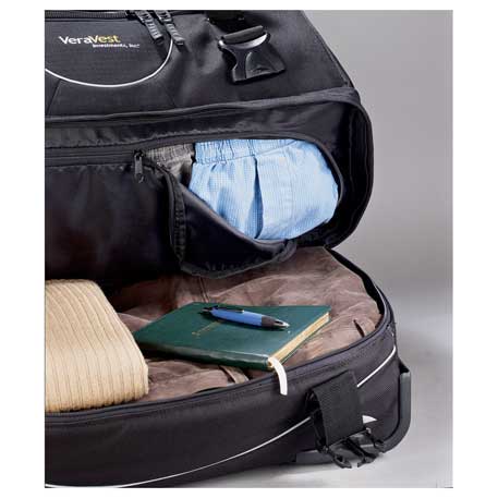 Large main compartment with zippered U-shaped opening. Drop-bottom lower compartment for shoes and clothes. Inline skate wheels and recessed, locking telescoping handle. Meets FAA carry-on regulations.