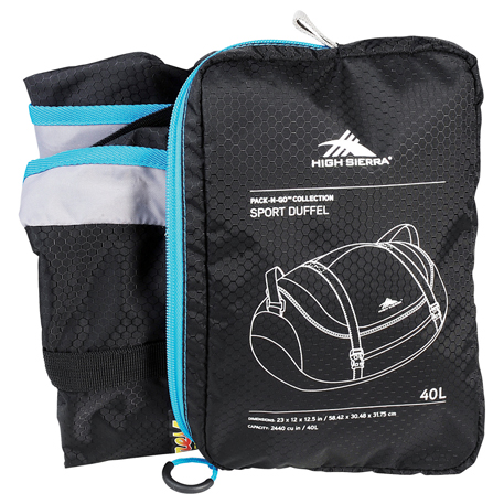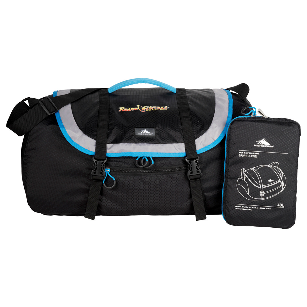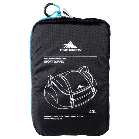 Lightweight nylon duffel packs into a separate tricot-lined headphone pouch for easy storage. 40 liter main compartment has a large zippered opening. Two top adjustable compression straps to stash extra layers or gear. Large adjustable over-shoulder webbing strap. Padded top carry handle. Sturdy, padded bottom panel. Front zippered accessory pocket.