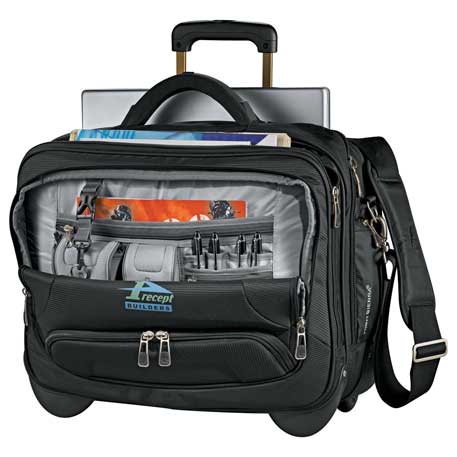 Two large compartments with adjustable padded computer sleeve in rear. Front file folder compartment that holds most 17″ laptops. Deluxe organizer panel with neoprene pockets, zippered mesh pocket, pen pockets, and removable key fob. Easy-access zippered front pocket. Easy-access corner mounted zippered pockets. Two large zippered side pockets. Recessed, telescoping handle. Inline skate-style wheels with corner protectors. Flexible add-a-bag system on back panel slips over the handle of a wheeled upright. Sure-grip molded grab handle with neoprene padding to wick away moisture. Detachable, adjustable shoulder strap with neoprene cushion and integrated grip details. Signature High Sierra® hardware.