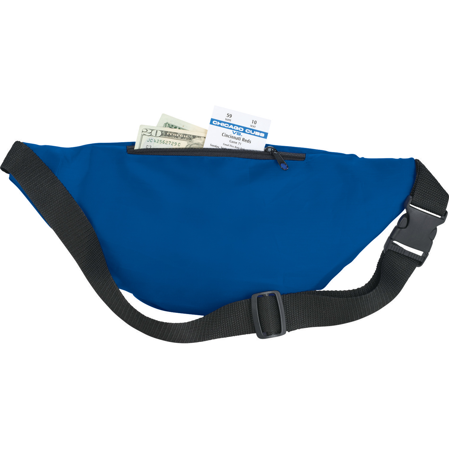 The Hipster Deluxe Fanny Pack lets you be cool on the go with its zippered main compartment zippered front pocket and a hidden zippered pocket in the back. It also comes with an adjustable waist strap and buckle for a perfect fit. The strap expands to about 47 inches.