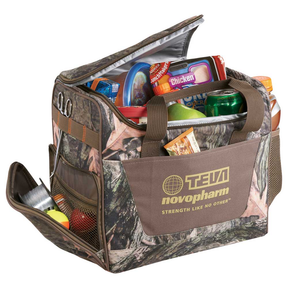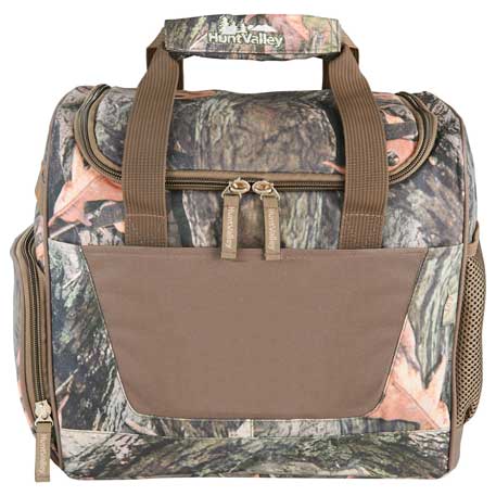 For the hunter within, this camouflage cooler features a brushed polyester exterior for a genuine outdoor experience while keeping your drinks or food cool in the woods. Zippered main compartment with large U-shaped opening. Open front pocket. Zippered side pocket and daisy chain for additional storage. Side mesh pocket. Dual-carry handles with wrap. Insulated PEVA lining. Subtle orange stitching and Hunt Valley® embroidered branding.