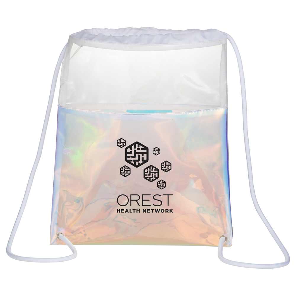 The Iridescent Drawstring Bag features a fun iridescent and clear PVC design. This bag include a cinch closure with quality webbing straps.