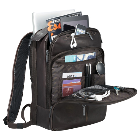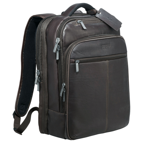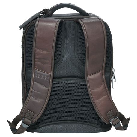 Executive styling and function are what make the Kenneth Cole® Colombian Leather checkpoint-friendly backpack stand out. Wrapped in premium soft Colombian leather, but packed with all the features you need for travel. The dedicated padded laptop compartment holds most computers up to 17″ and unzips to lay flat through security so you do not need to remove your laptop. Organization is layered throughout with zippered pockets dedicated for your cables, mobile chargers, travel mouse, pens, business cards and even a lined drop pocket for your sunglasses. Large zippered main compartment has a dedicated pocket for your tablet or iPad, and is big enough for your padfolio and folders. The padded back keeps you cool and the bag comfortable and also includes an integrated trolley sleeve to make it even easier to travel. Includes a matching Kenneth Cole Colombian leather luggage tag.