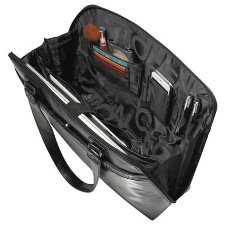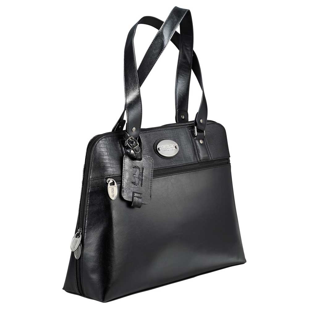 Stay on-trend on your way to work with this fashion-forward snake-trimmed Kenneth Cole® Women’s Tote. Zippered main compartment unzips to the bottom of the bag. Padded computer pouch holds most 16″ computers. Also includes a padded pocket for your iPad, tablet or eReader. Main compartment also has a deluxe organization panel with multiple pockets for your phone, pens, cards and more. Zippered front pocket. Rear trolley sleeve pass-through to make travel easier for you. Supportive bottom feet. Includes vinyl identification tag for decorating. Signature Kenneth Cole® hardware and lining.