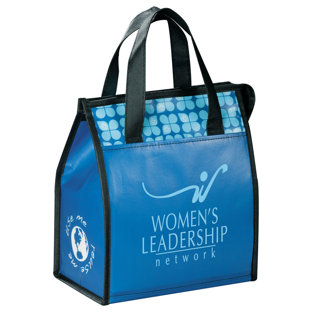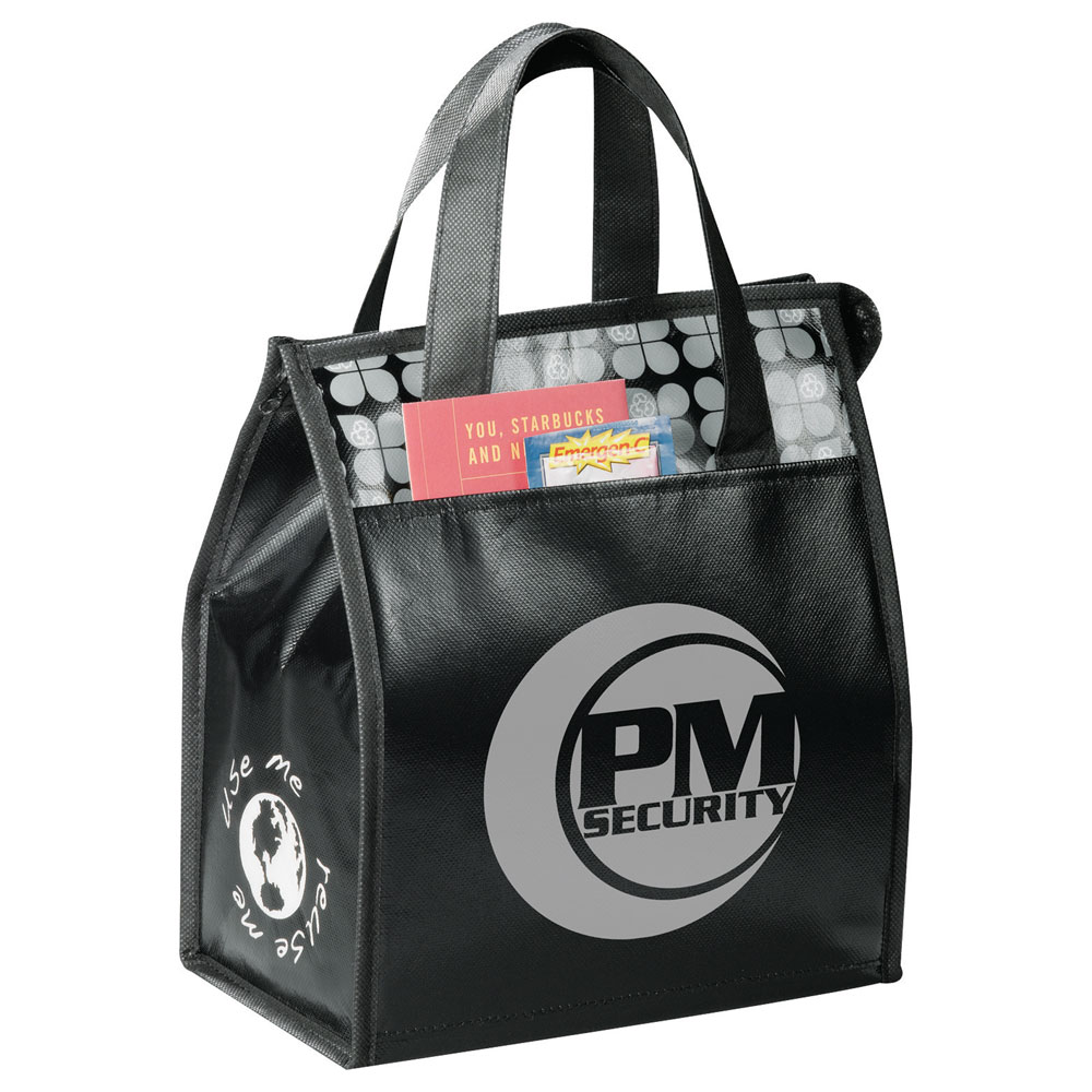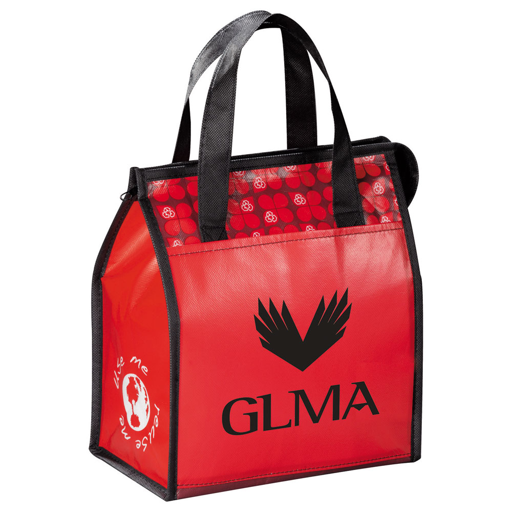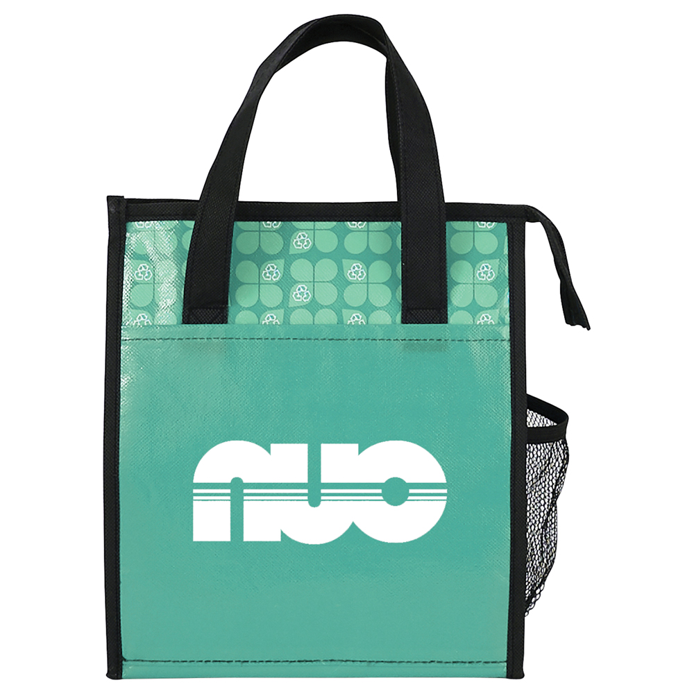 Zippered main compartment. Open front pocket and side mesh pocket. Rear ID space. Laminated material is water-resistant and easily wipes clean. Reinforced double handles with 5″ handle drop height. Insulated with heat-sealed water-resistant lining.