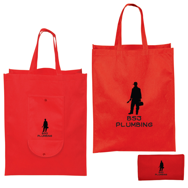 15” W x 18.75” H x 7.5” D • Non woven 90 gram polypropylene • Larger version of our popular NW4733 folding tote • Handy sized tote bag that folds into its own pouch • Front lower pocket imprint can be seen on the back of pouch when closed • Two self-material shoulder straps • Ideal replacement for plastic shopping bags • Shipped flat; not folded SP PP PS – 4” W x 1.5” H (front lower pocket when open – back of pouch when closed) SP PP PS – 10” W x 10” H (back when open) TR – 10” W x 5.5” H (back when open) To have the tote bag folded into the pouch prior to shipping, please add $0.40(E) each
