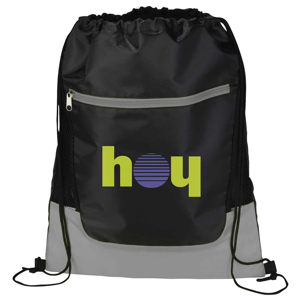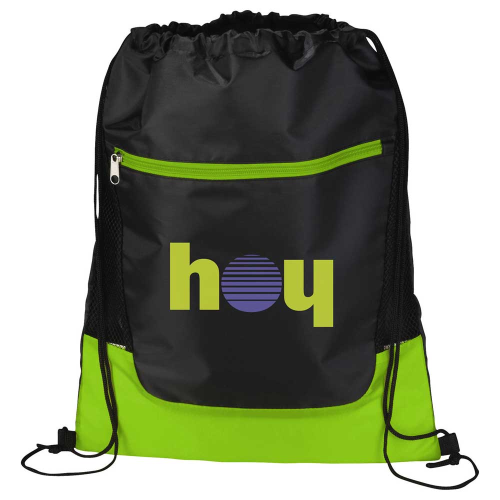 The Libra Front Zipper Drawstring Bag has an open main compartment with cinching rope closure. It also features a zippered front pocket and reinforced bottom corner tabs.