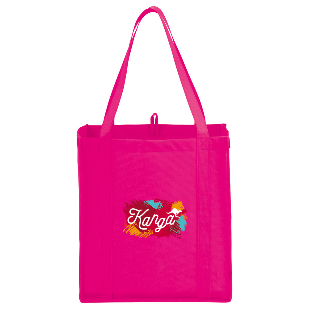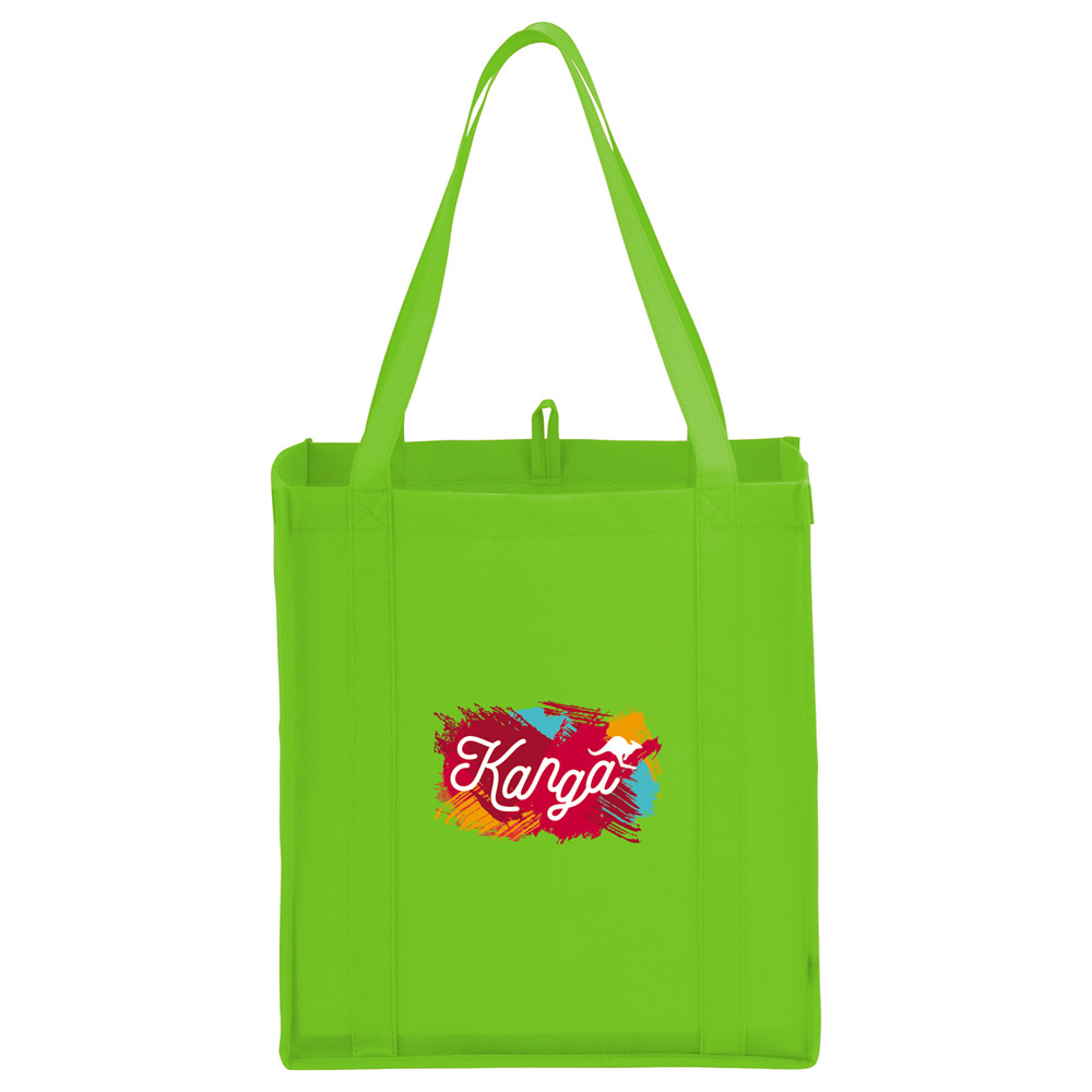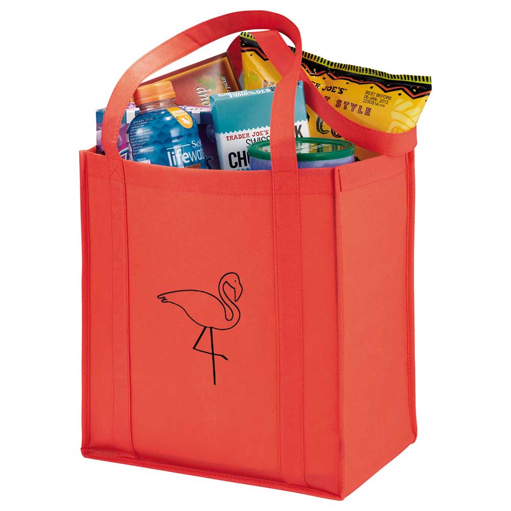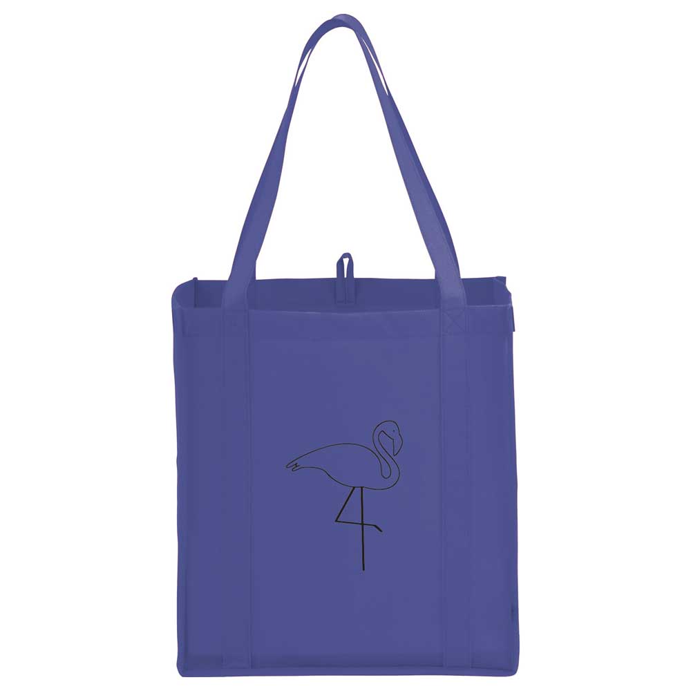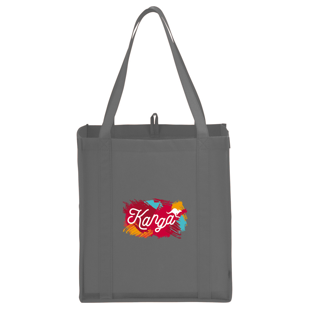 Perfect alternative to plastic bags. Open main compartment. Supportive bottom board. Interior fabric loop at opening for attaching bag to supermarket checkout frames. Reinforced handles and binding for added durability. 10″ handle drop height. Gusset & Handle Decorating is Transfer/PhotoGrafixx Only and does not qualify for SureShip.