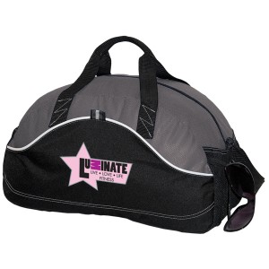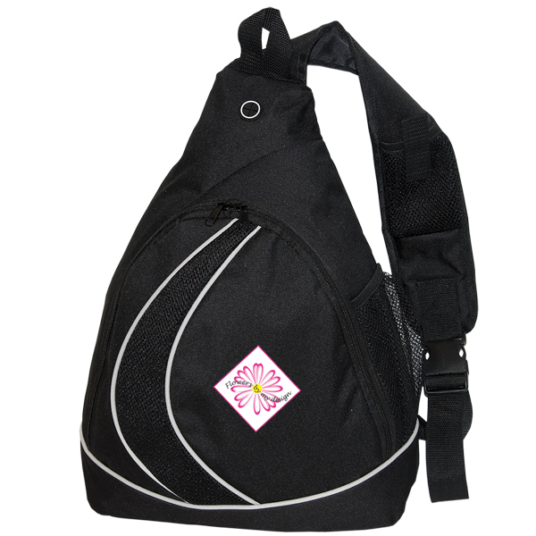 15.5” W x 15” H x 7.5” D • 600D Polyester and Mesh • Adjustable and padded single strap with mesh cell phone/MP3 pocket • Top carry handle • Padded back • Triangular shaped main compartment • Grommet holes for headphone wires • Front triangle shaped zippered opening • Side mesh pocket • Perfect for day trips • See SP5268 for matching duffle TR PP PS – 3” W x 3” H (front)