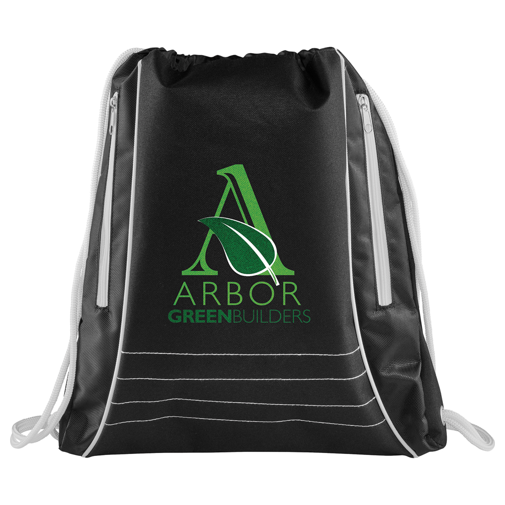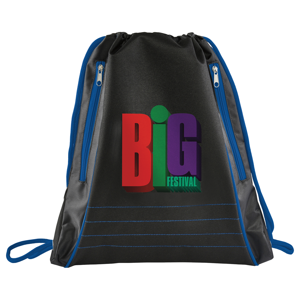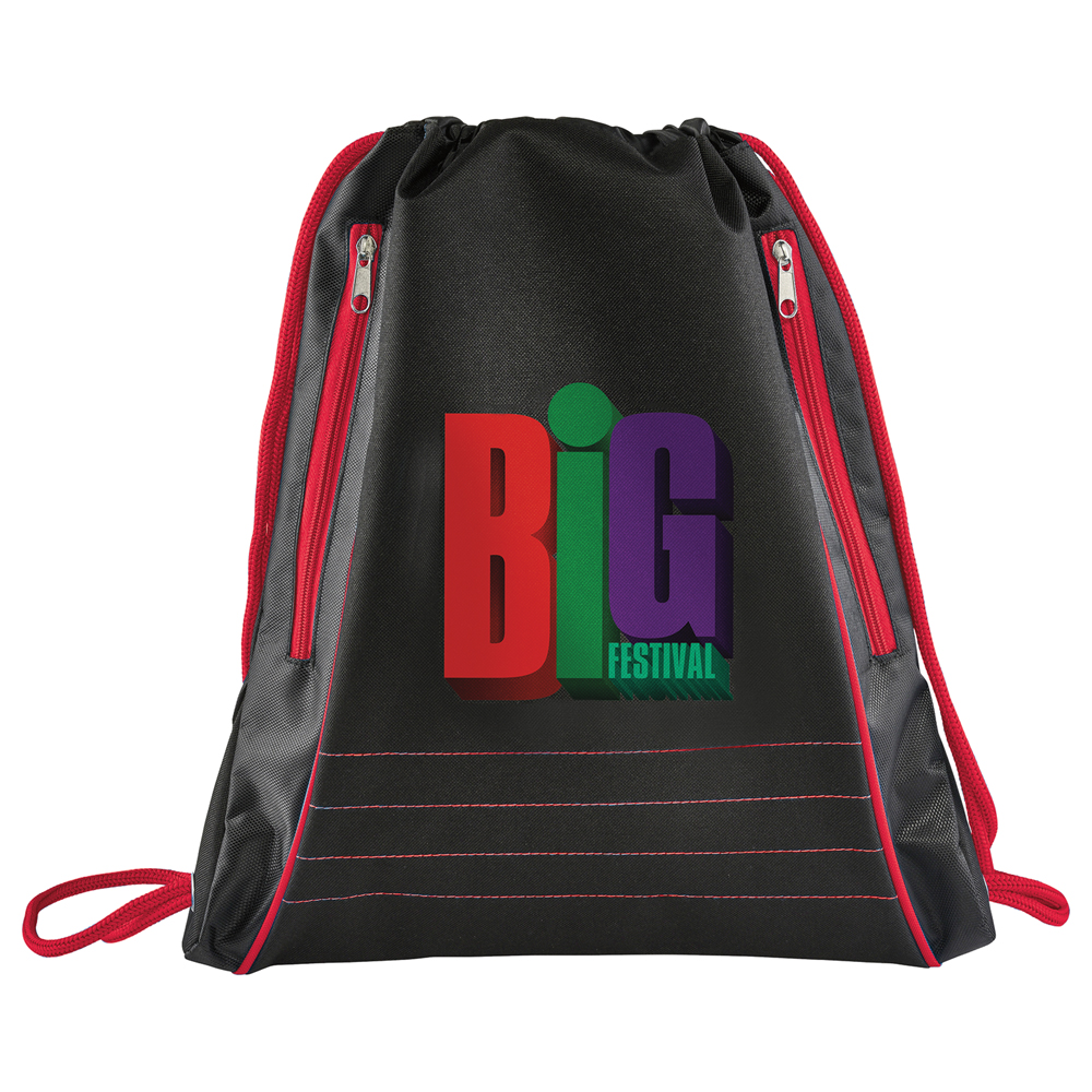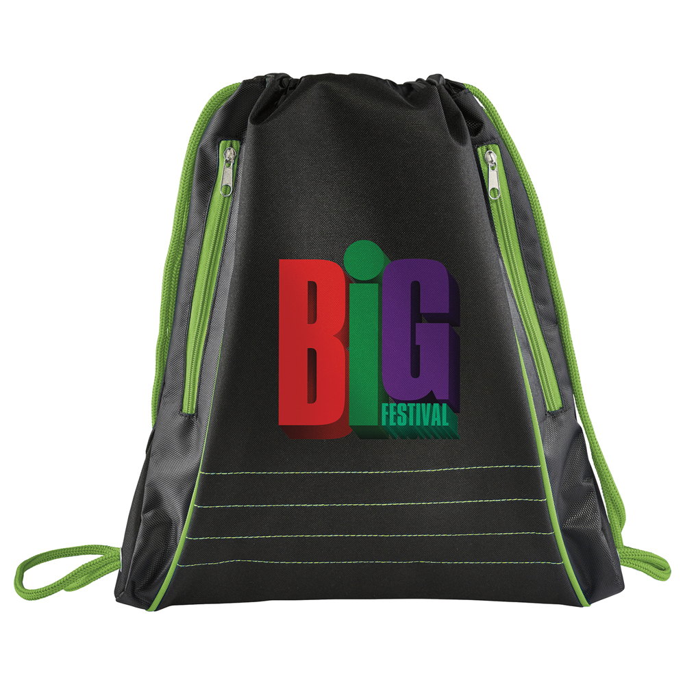 The Neon Deluxe Drawstring Bag features color pop accents, stitching and piping throughout and an open main compartment with a cinching closure and two easy access zippered pockets on the front.