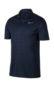 100% polyester. Dri-FIT. Standard fit Swoosh on left chest. Rolled-forward shoulder seams. Seasonal stripe pattern with subtle sheen embossed throughout. 2-button placket. Sweat-wicking technology.