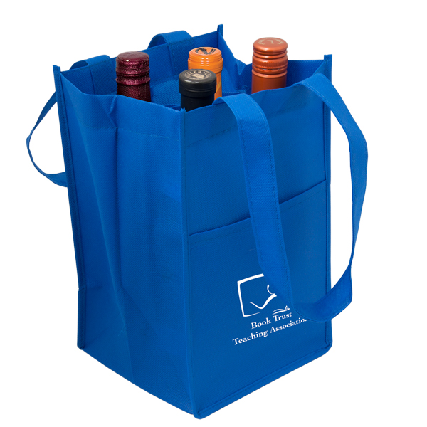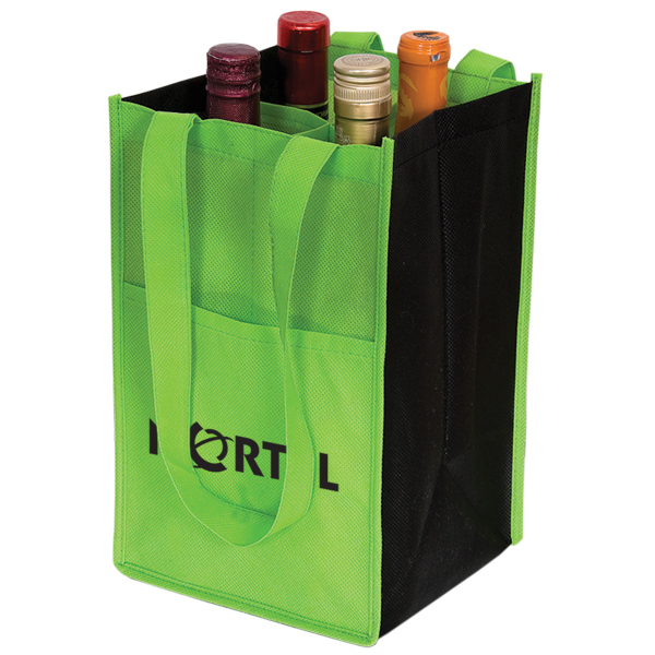 6.75” W x 11” H x 6.5” D • Non woven 90 gram polypropylene • Transport your wine bottles with this durable and easy to carry bag • Also holds 1.5 litre or 1 litre soda bottles or cartons • Front slash pocket • Inside dividers for added strength and stability • Fold flat when not is use SP PP PS – 3.5” W x 3.5” H (front pocket)