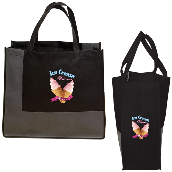 15.5” W x 14” H x 6.25” D • Non woven 90 gram polypropylene • Distinctive ‘L’ shaped coloured design on both sides • Extra large gusset SP PP PS – 8″ W x 5.5″ H (front/back) SP PP PS – 3″ W x 7″ H (gusset)