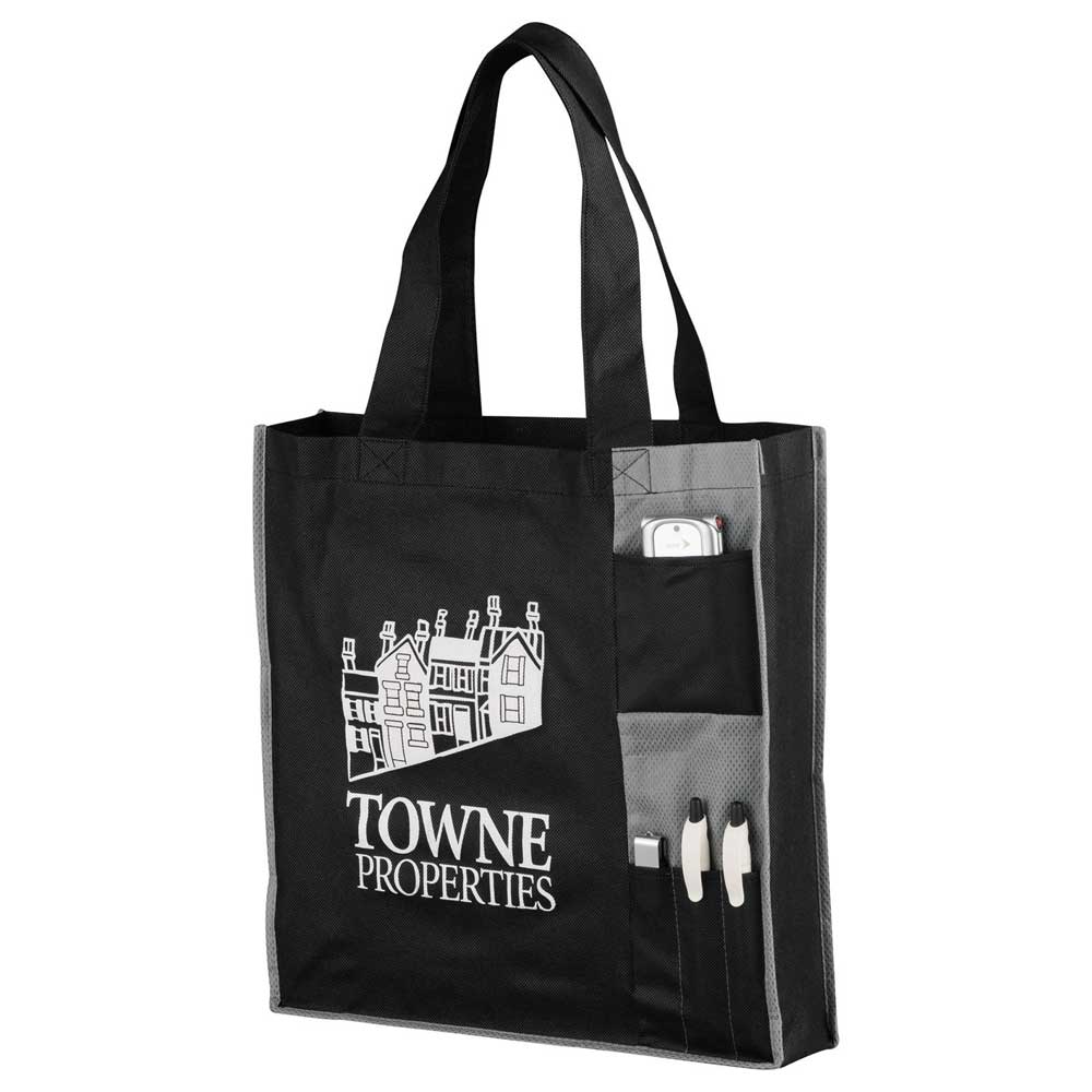 Great for tradeshows, conventions, and business meetings. Open main compartment. Front pocket and pen sleeves. Contrast accents and stitching. Reinforced handles. 11″ handle drop height. Gusset & Handle Decorating is Transfer/PhotoGrafixx Only and does not qualify for SureShip.