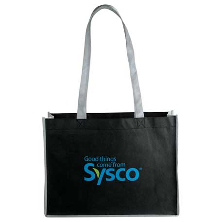 Perfect alternative to plastic bags. Open main compartment. Side pocket. Reinforced contrast handles, binding and gusset. 14″ handle drop height.