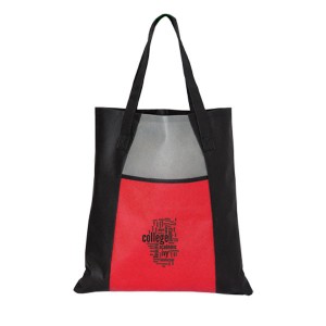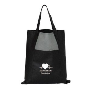 15″ W x 16″ H • Non woven 80 gram polypropylene • Self-material cross stitched handles/shoulder straps • Front open slash pocket