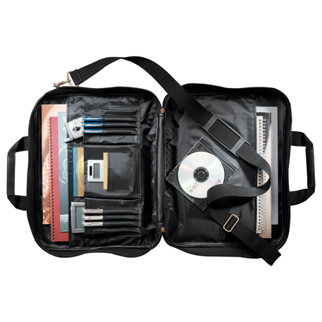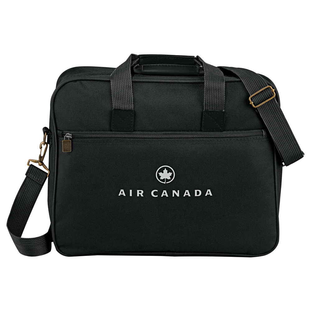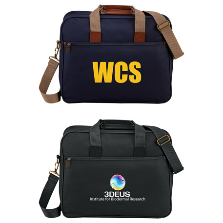 Fully-opening zipper on main compartment. Functional organizer for phone, business accessories and files. Unique carry option on back for umbrella or presentation tube. Detachable, adjustable shoulder strap.