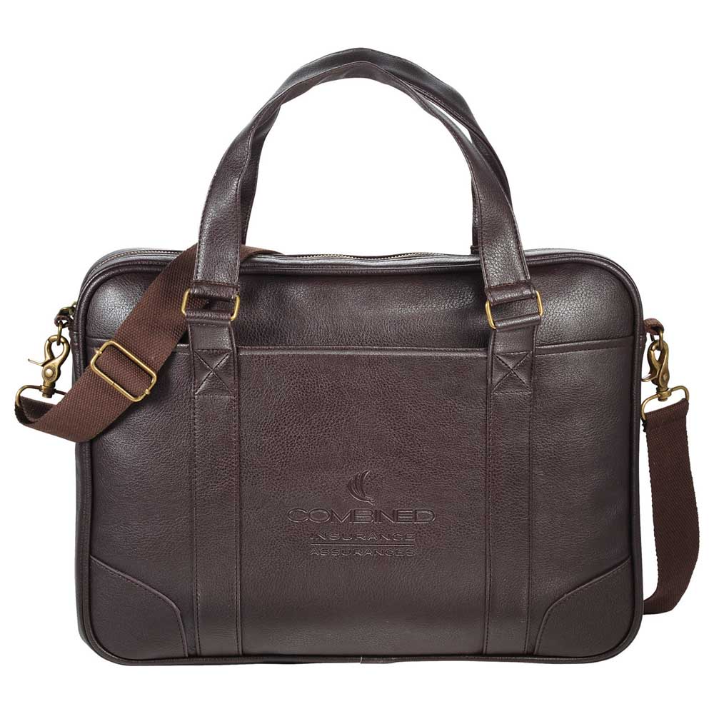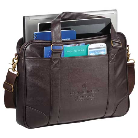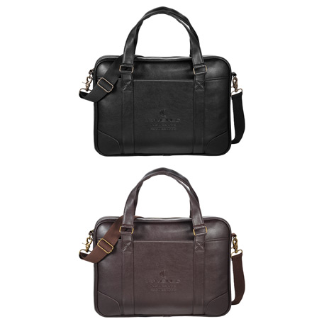 Make a sound investment with the Wall Street inspired executive professional collection. Standard features include a zippered main compartment that fits up to a 15” laptop, folders, books, and files. Interior organizational pockets for your iPad, Surface, or other tablet device and additional business essentials, as well as a front hook and loop closure pocket for extra storage. Detachable, adjustable shoulder strap, carrying handles, and trolley sleeve for ease of travel. Antique bronze hardware.