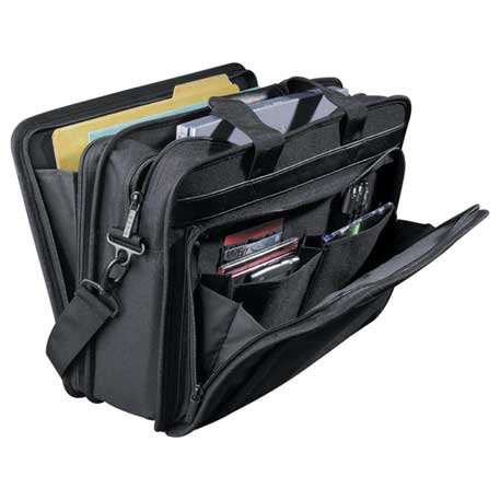 Deluxe front organizer conceals all accessories and documents. Rear accordion file divider. Padded computer compartment holds most computers up to 15″. Detachable, adjustable shoulder strap.