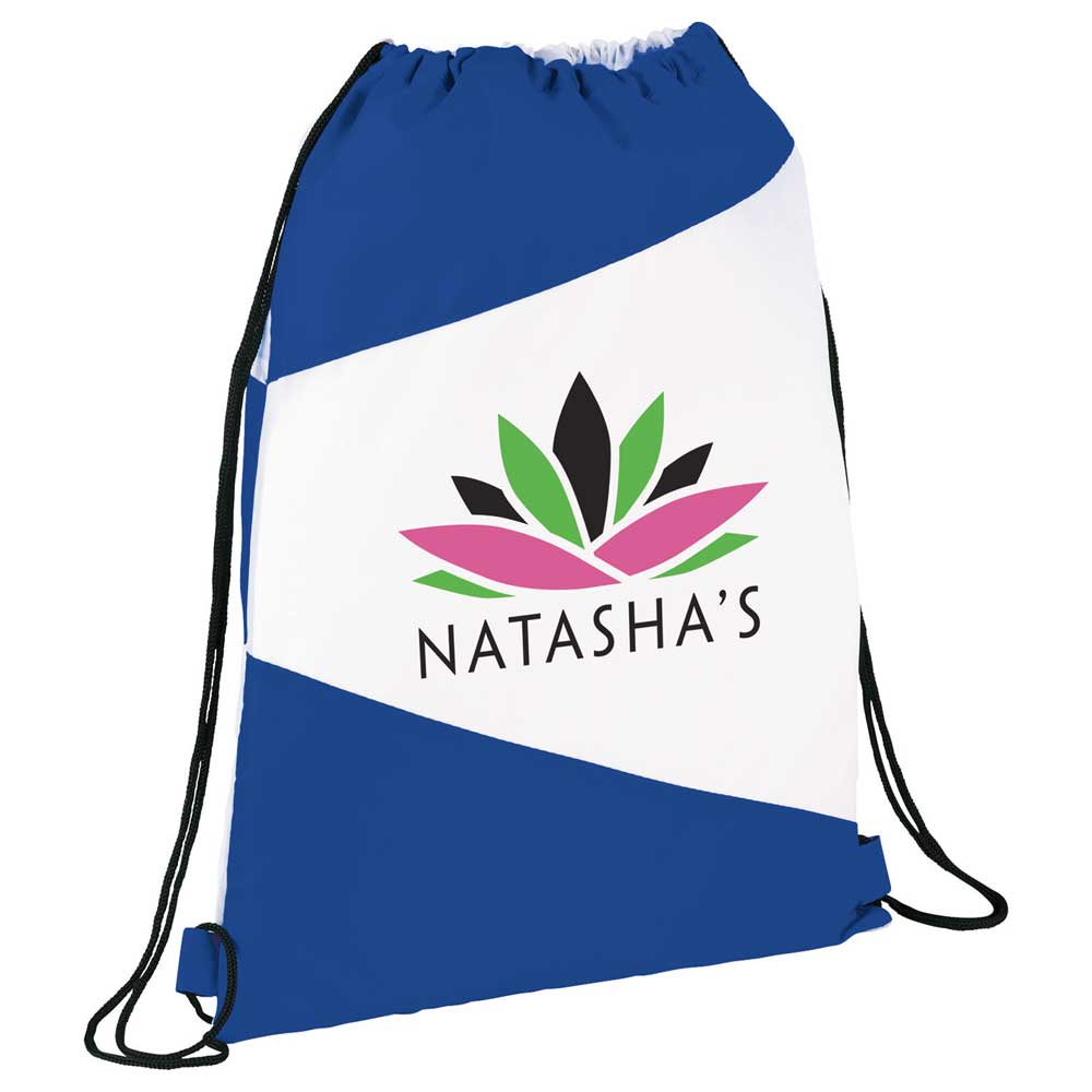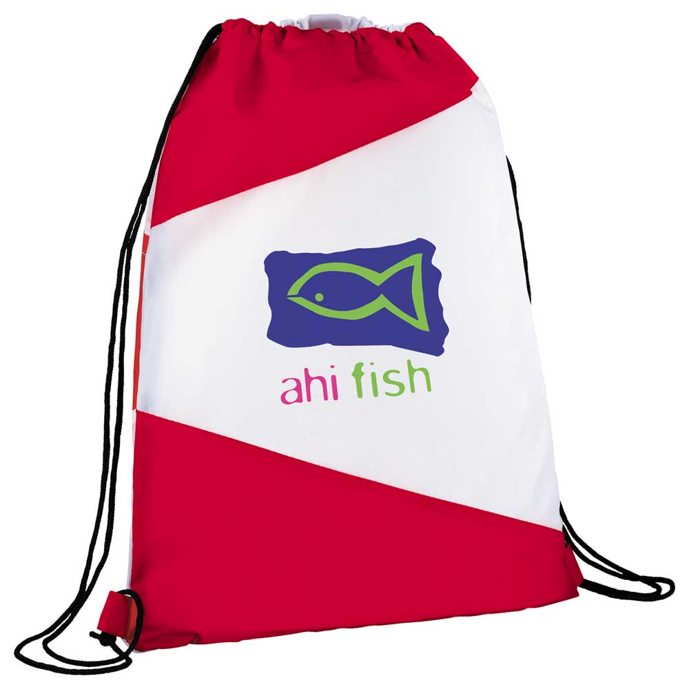 The Pennant Drawstring Bag has an open main compartment with cinching rope closure. The back panel is the opposite color blocking as the front panel.
